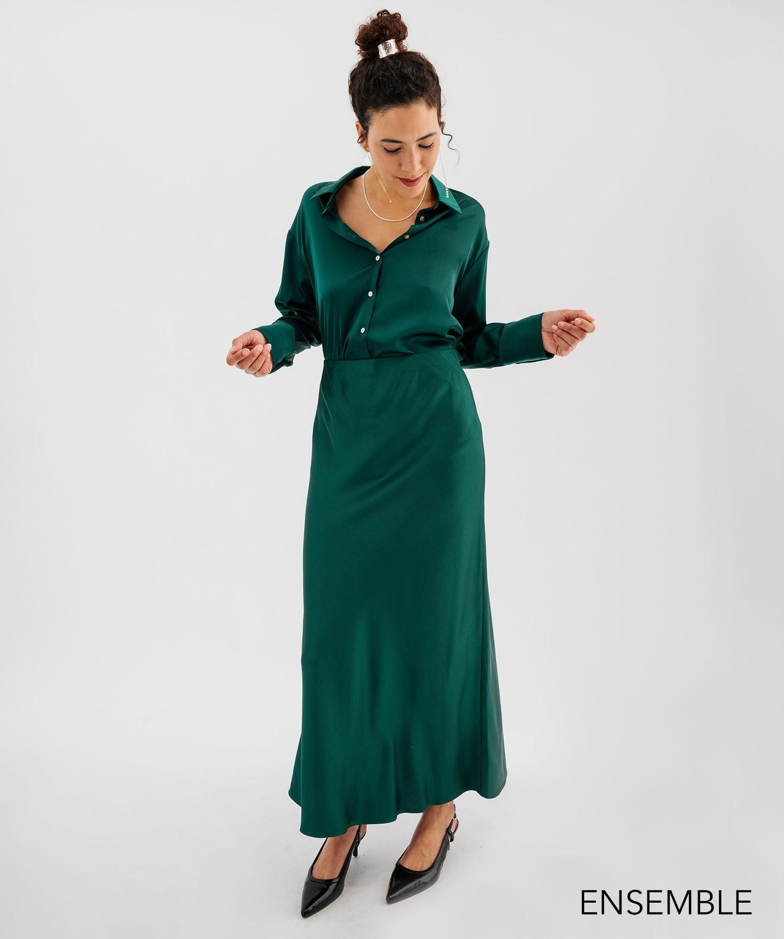 Cet ensemble en satin vert, composé d’une chemise fluide et d’une jupe assortie, allie fraîcheur et style. Idéal pour une tenue habillée qui reste légère, parfaite pour les beaux jours ou une soirée estivale.