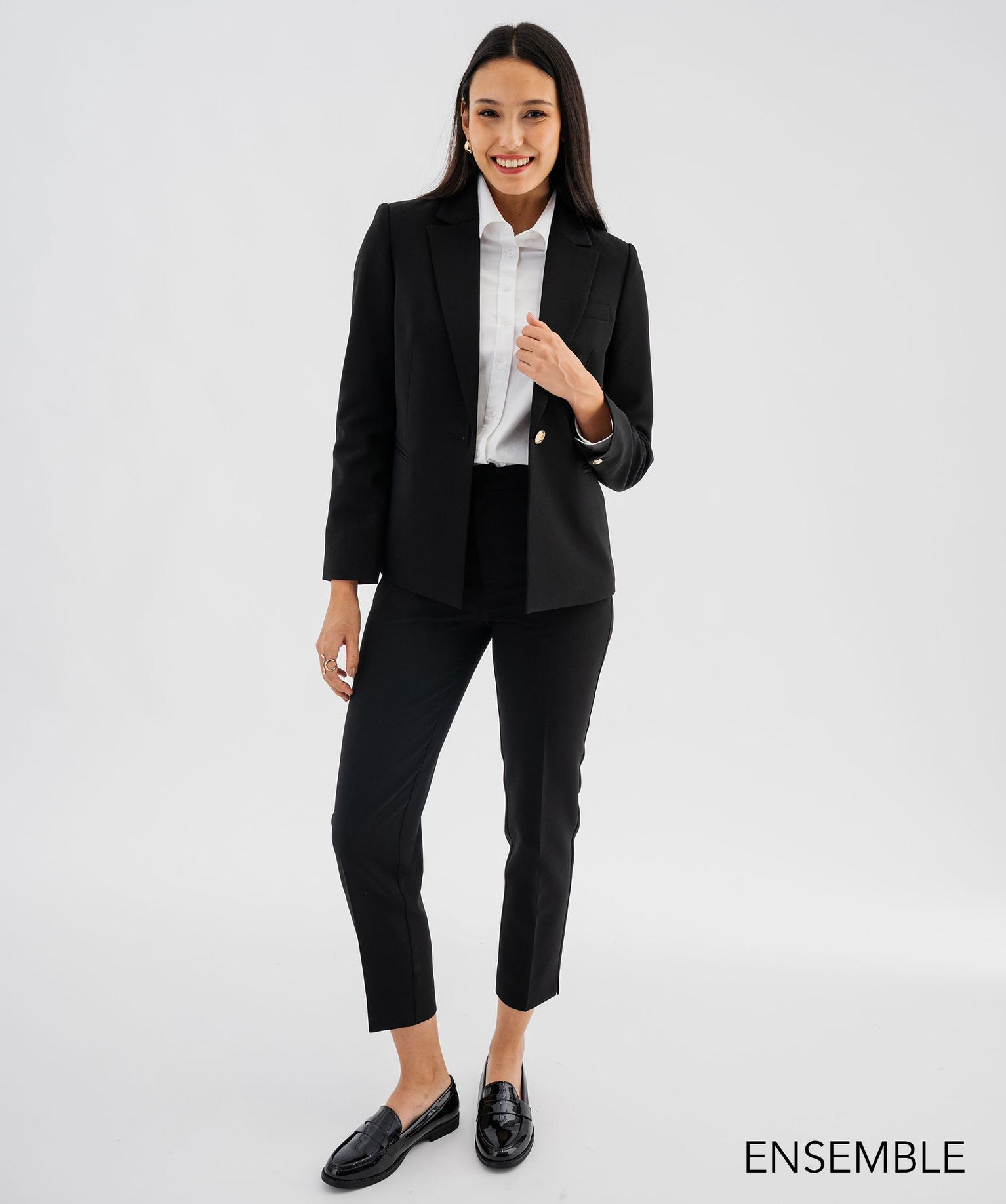 Intemporel et sophistiqué, cet ensemble de costume noir pour femme se compose d’un blazer structuré et d’un pantalon assorti. Une tenue chic, idéale pour un look habillé ou professionnel.