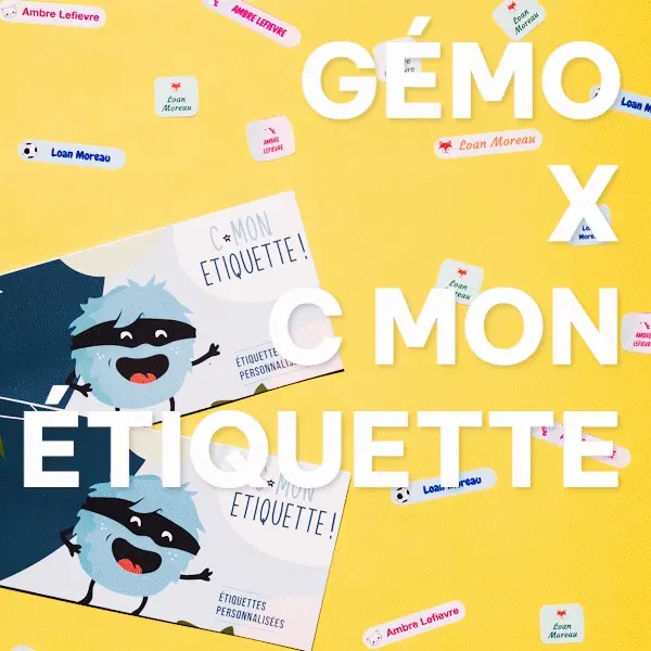 *Offre valable pour les adhérents au programme de fidélité G'M du 08/04/2026 au 28/04/2026 sur tous les articles bébé ou enfant chaussures, textile et accessoires. Afin de bénéficier du carnet d'étiquettes offertes sur le site c-monetiquette.fr, un code sera envoyé par mail au client le lendemain de son achat en magasin ou expédition du colis pour une commande sur GEMO.FR, pour tout achat d'articles bébé ou enfant. Offre cumulable avec les offres en cours. Commande possible jusqu'au 31/05/2026 sur le site de c-monetiquette.fr. Le carnet offert contient 10 étiquettes autocollantes et 10 thermocollantes d'une valeur de 6€. Frais de port non inclus d'une valeur de 2€ sur le site c-monetiquette.fr.