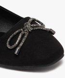 Élément incontournable de toute garde-robe féminine, la ballerine plate revêt un look discrètement original dans cette version confectionnée en suédine avec un bout carré. Ces ballerines femme, largement décolletées, sont ornées d'un nœud recouvert de strass brillants sur l'avant. Elles incarnent l'intemporalité et le confort tout en bénéficiant d'une petite touche de bling pour habiller avec soin toutes vos tenues.