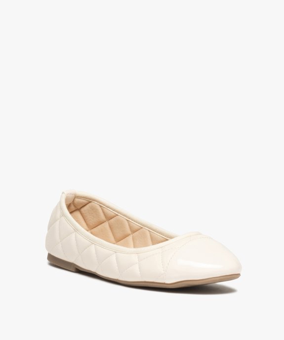 Les classiques ballerines pour femme adoptent un tout autre style. Leur tige affiche un effet matelassé, alors que le bout rond typique des ces chaussures citadines, est ici verni, ton sur ton. Le talon reste plat, respectant le code des ballerines traditionnelles pour une marche facile en journée comme en soirée. On les imagine facilement portées avec un jean coupe droite et un joli bustier. Un must-have !