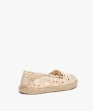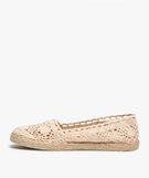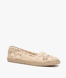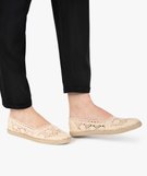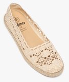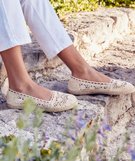 On retrouve ici tout le charme de l’espadrille : semelle extérieure bordée de corde et tige en toile à deux empiècements droits. Avec, en plus, l’inspiration bohème du macramé ! Le dessus de ces ballerines femme originales est entièrement confectionné en macramé. Pour plus de confort, de discrets renforts en toile ont été posés à l’intérieur de ces chaussures estivales, au bout et derrière le talon. Des ballerines débordantes de charme à combiner avec une robe longue dans un vrai esprit bohème. Chaussure non doublée.