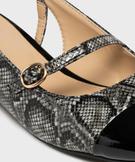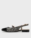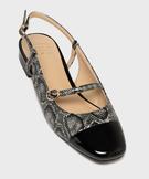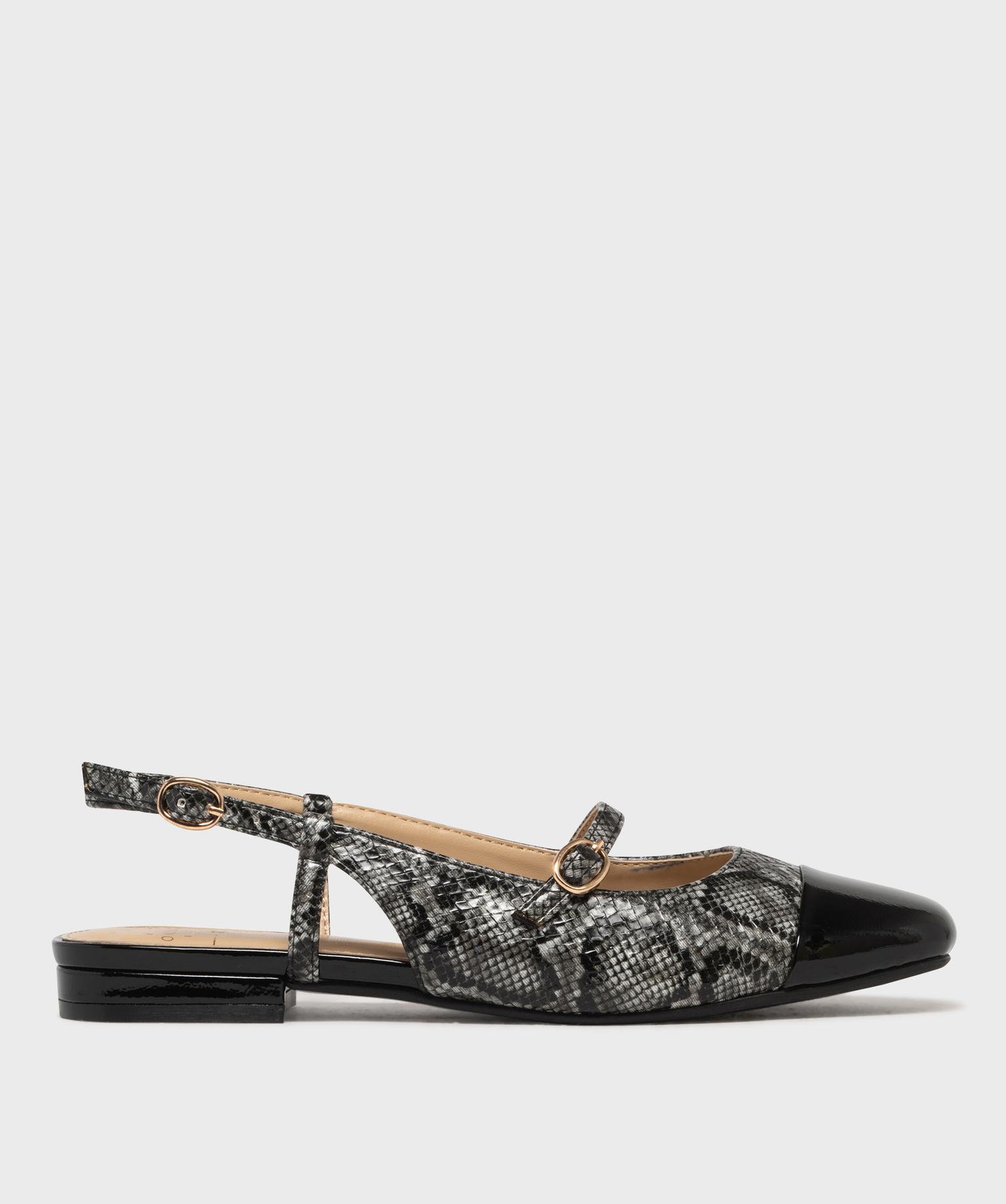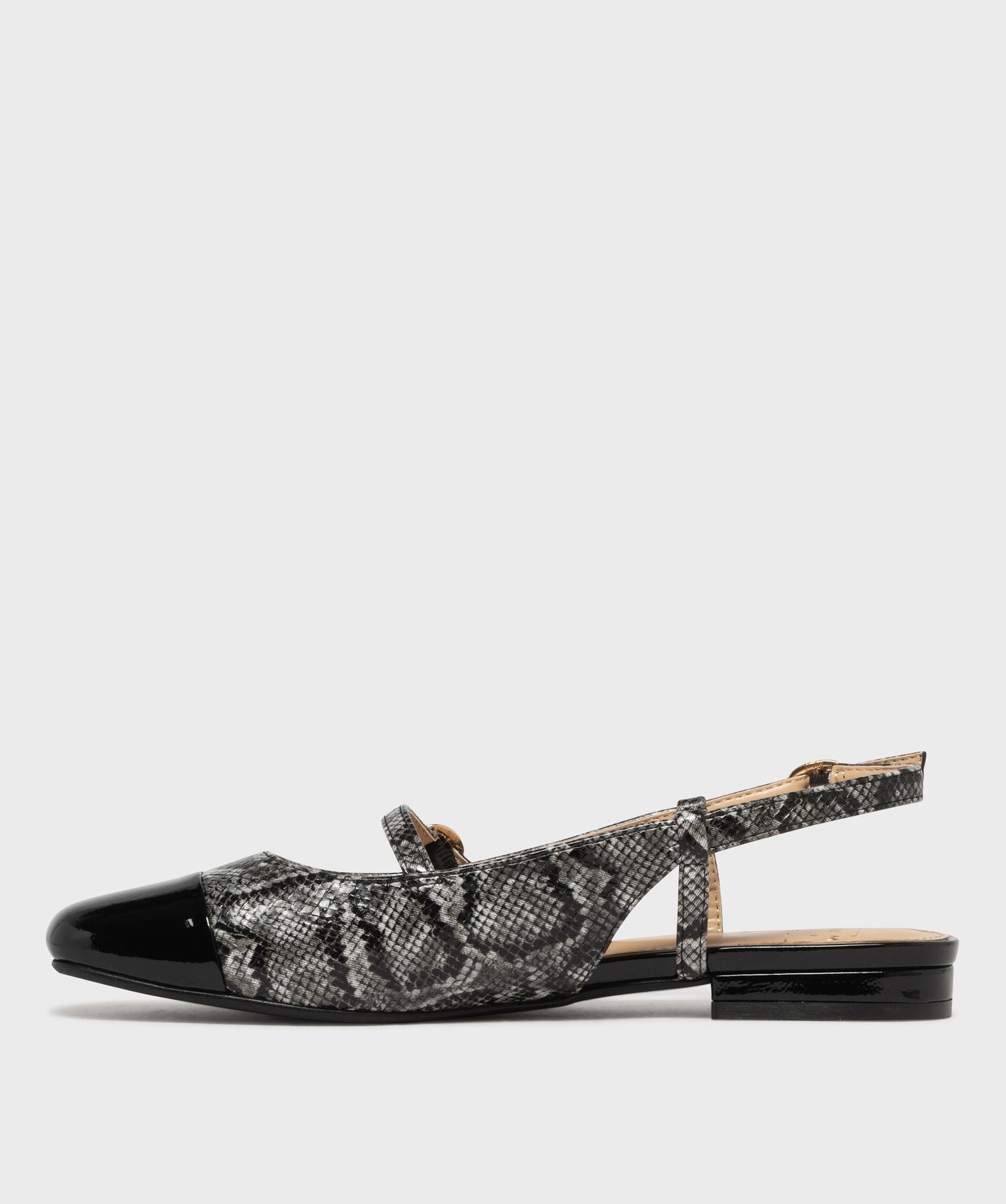 Osez le glamour à talon plat et l'originalité avec ces ballerines femme ! Des ballerines slingbacks avec une fine bride à boucle à la cheville et sur le dessus pour mettre en valeur le pied. Les ballerines se parent d'une tige imprimé serpent, moderne et audacieux. Le bout est verni brillant, pour une élégance raffinée et intemporelle. Les chaussures complètent à merveille un jean slim 7/8e ou une jupe midi avec son petit talon plat.