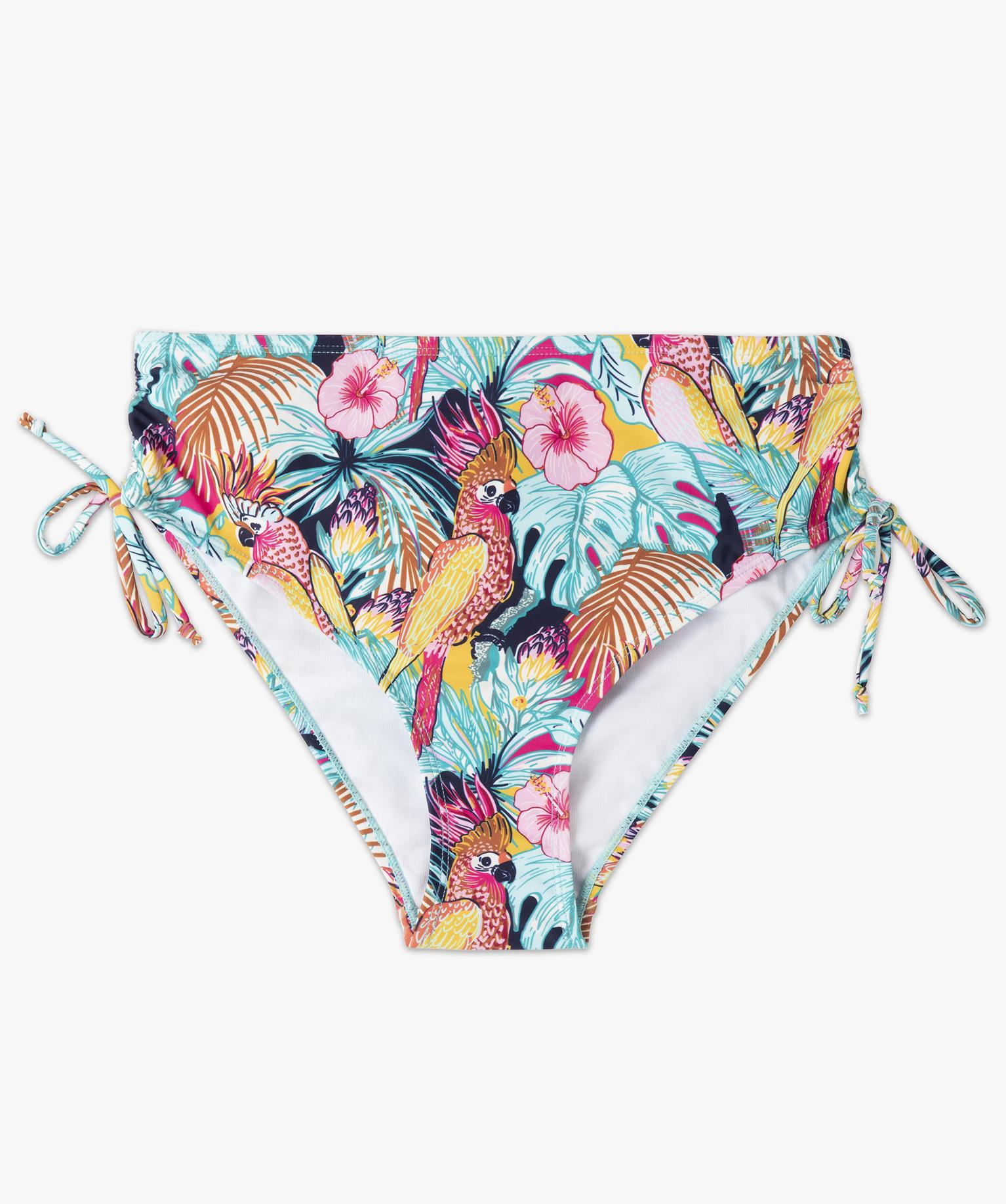 Cet été, offrez-vous une silhouette d’inspiration rétro grâce à cette culotte de bain taille haute. Un bas de maillot de bain femme à la forme particulièrement seyante pour la silhouette et décliné dans des coloris pétillants avec motifs exotiques. Il est doté de petits liens sur les hanches qui offrent un effet plus ou moins froncé selon vos envies. Ce bas de maillot de bain est entièrement doublé et confectionné à partir de matières recyclées. Il se porte avec le soutien-gorge de bain assorti.