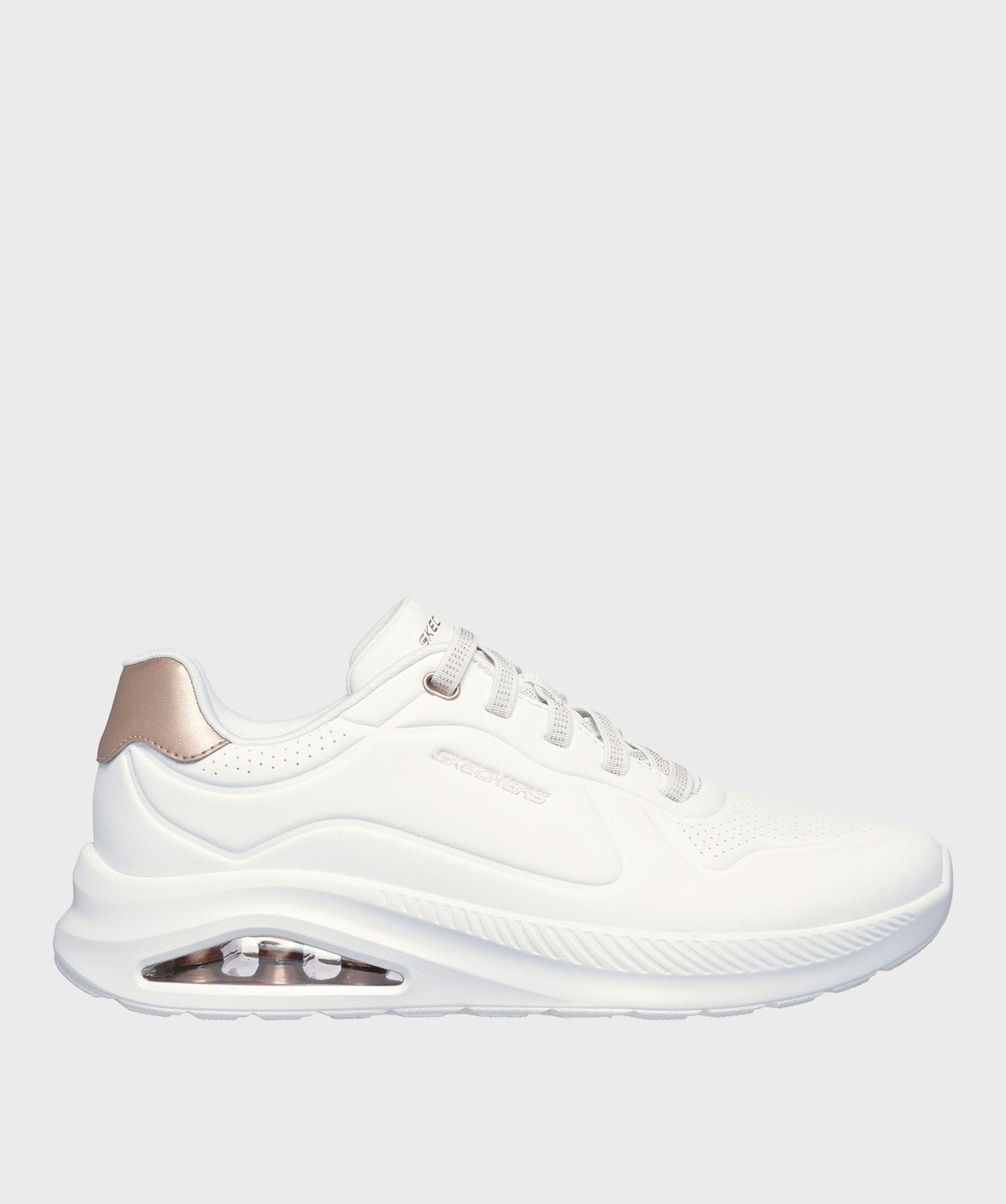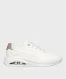 Ces baskets Skechers Street™ UNO Con-Air - Conveyance rehausseront tous les looks féminins, qu’ils soient sportifs ou citadins. Elles affichent une tige en matière synthétique durabuck unie, agrémentée de perforations et de lignes embossées au design dynamique et tendance. Un patch métallisé au talon et des inscriptions signatures ajoutent une touche de lumière au modèle. Munies de lacets élastiques et de larges élastiques dissimulés sous la languette, ces baskets pour femme s’enfilent facilement et offrent un excellent maintien du pied. Elles reposent sur une semelle amortissante légèrement compensée avec coussin d'air visible Skech-Air® au niveau du talon.