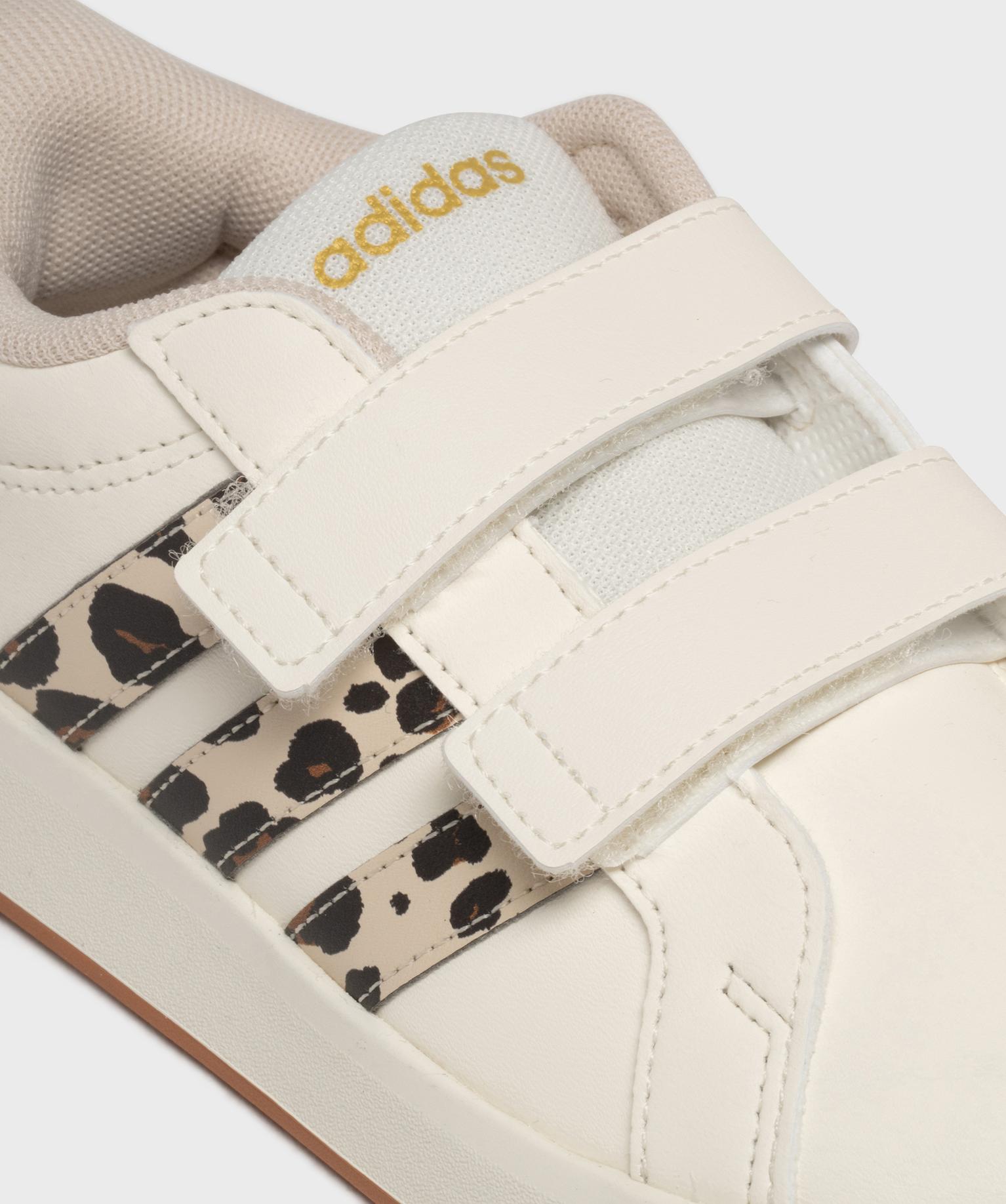 Ces baskets pour fille Adidas Grand Court 3.0 revisitent un style rétro avec une touche ultra mode. Leur silhouette sobre est dynamisée par des bandes et un contrefort à imprimé léopard, pour un look tendance et craquant. Faciles à enfiler grâce à leurs deux brides scratch, les sneakers offrent un excellent maintien. La languette en mesh épais et le col généreusement rembourré assurent un confort optimal. La semelle intérieure en mousse, amovible et ultra douce, est dotée d’un indicateur de pointure pour faire le meilleur choix et accompagner parfaitement les petits pieds en pleine croissance.