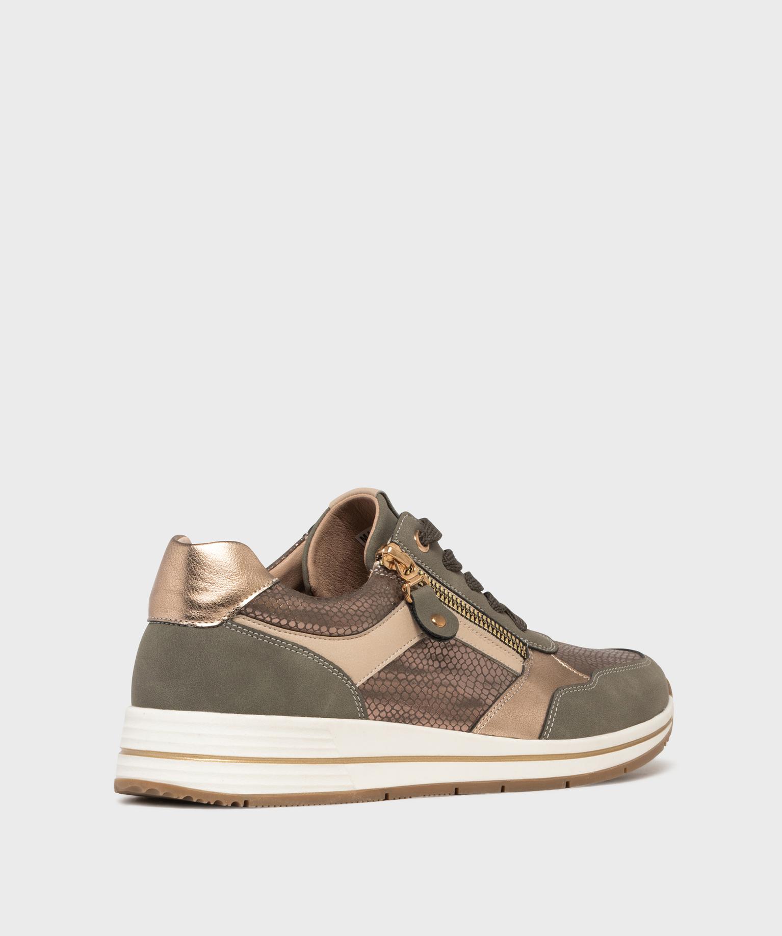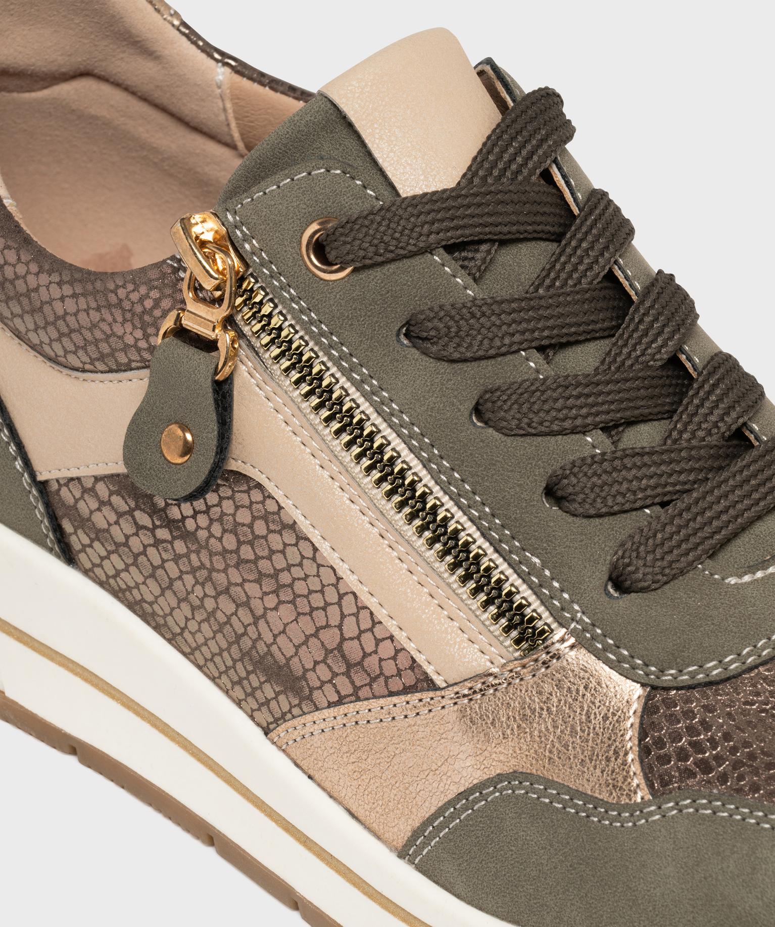 Ces sneakers compensées Valentina Baldano affichent un talon de 4 cm qui élance la silhouette. Elles se ferment facilement grâce à des lacets plats et un zip sur le côté extérieure. La semelle crantée reste fine et élégante. Les baskets pour femme mélangent un imprimé serpent métallisé avec des empiècements brillants et des empiècements colorés mats qui créent un contraste moderne. Le col rembourré et la semelle intérieure moussée garantissent un très grand confort. Ces chaussures féminines et décontractés dynamisent un jean ajusté comme une robe portefeuille.
