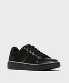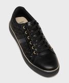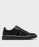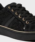 Cultivez votre féminité même en sneakers avec ces baskets femme ! Des baskets basses à lacets dont la tige combine matière synthétique lisse, empiècement textile pailleté et détails dorés, dans un esprit très couture. La semelle blanche est souligné d'or. Des chaussures résolument féminines et décontractées, prévus pour sublimer votre jean fétiche et accompagner vos robes du quotidien. Fermeture lacets plats 6 œillets. Col et semelle intérieure moussés. Talon et bout renforcés.
