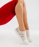 Cultivez votre féminité même en sneakers avec ces baskets femme ! Des baskets basses à lacets dont la tige combine matière synthétique lisse, empiècement textile pailleté et détails dorés, dans un esprit très couture. La semelle blanche est souligné d'or. Des chaussures résolument féminines et décontractées, prévus pour sublimer votre jean fétiche et accompagner vos robes du quotidien. Fermeture lacets plats 6 œillets. Col et semelle intérieure moussés. Talon et bout renforcés.