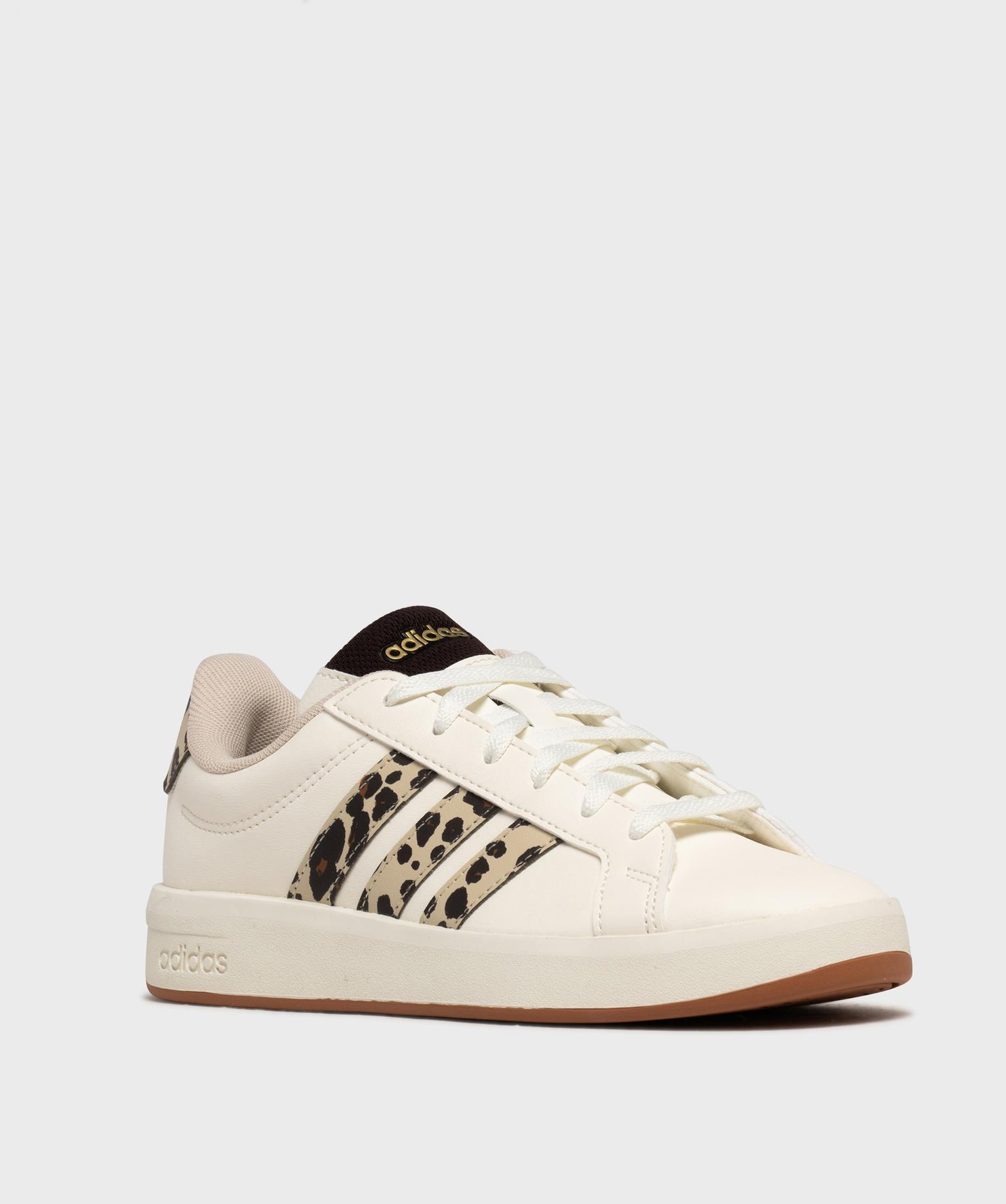 Les iconiques Grand Court 3.0 Adidas s’affichent dans une version animale terriblement tendance ! Sur ce modèle, les trois bandes signatures sont revisitées dans un motif léopard élégant. Un patch assorti complète le look tandis qu’un empiècement en mesh avec inscription dorée sur la languette ajoute une touche de fantaisie supplémentaire. Ces baskets femme sont dotées d’un épais rembourrage sur le col, d’une semelle intérieure moelleuse amovible et reposent sur une semelle amortissante avec couche d’usure colorée. Fermeture lacets 6 oeillets.