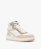 Ces baskets femme associent une tige mid cut d'inspiration rétro à une semelle épaisse contemporaine et des touches de motif léopard indémodable ! Un mix particulièrement réussi, qui s'associera aussi bien avec un jean retroussé qu'une robe courte ou une combinaison pantalon ! La tige est rehaussée de liserés métallisées et d'empiècements pastel. Les baskets montantes se ferment à l'aide de lacets plats sur 8 œillets. Le bout est marqué de perforations sur le dessus.
