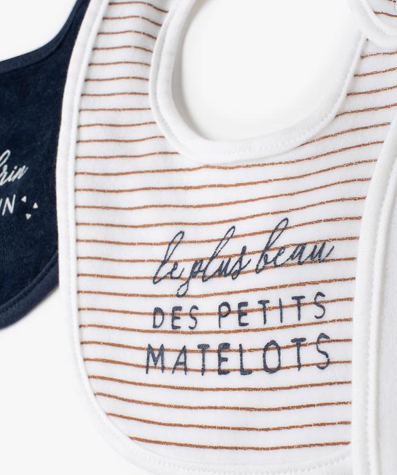 Un lot de 3 bavoirs naissance qui possèdent une taille idéale pour les premiers repas de bébé. Ces bavoirs bébé garçon sont confectionnés dans un velours ras très doux orné de petits motifs ou de messages craquants. Ils sont doublés de jersey de coton pour une protection optimale des vêtements. Ces bavoirs s’attachent facilement à l’aide d’un bouton pression sur le côté, facile à détacher lorsque bébé s’endort après le repas. Le lot se compose de 3 bavoirs différents déclinés dans des coloris neutres faciles à marier avec l’ensemble du vestiaire de bébé.