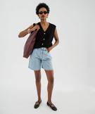 Fraîcheur et style sont au rendez-vous avec ce bermuda en jean délavé pour femme à la coupe ample. On craque pour ses plis plats à l’avant qui accentuent le volume et lui donnent un joli tombé. Son denim clair, doux au toucher, apporte une touche estivale parfaite pour la saison. Avec sa taille haute flatteuse et ses poches arrondies devant, le bermuda se porte facilement avec un tee-shirt rentré, une blouse légère ou un crop top. Passants pour ceinture. Fermeture zip + bouton. 2 poches devant + 2 poches plaquées au dos.