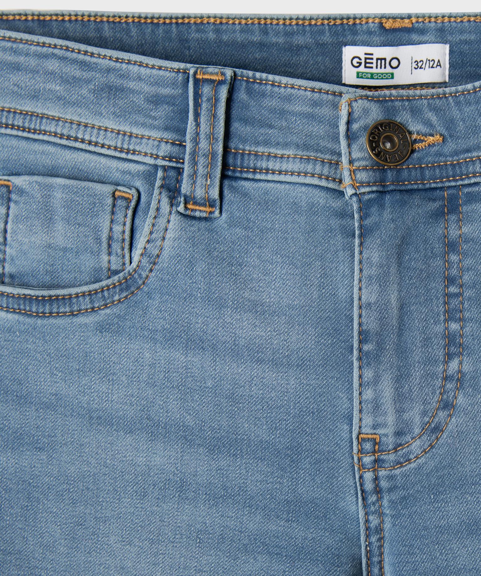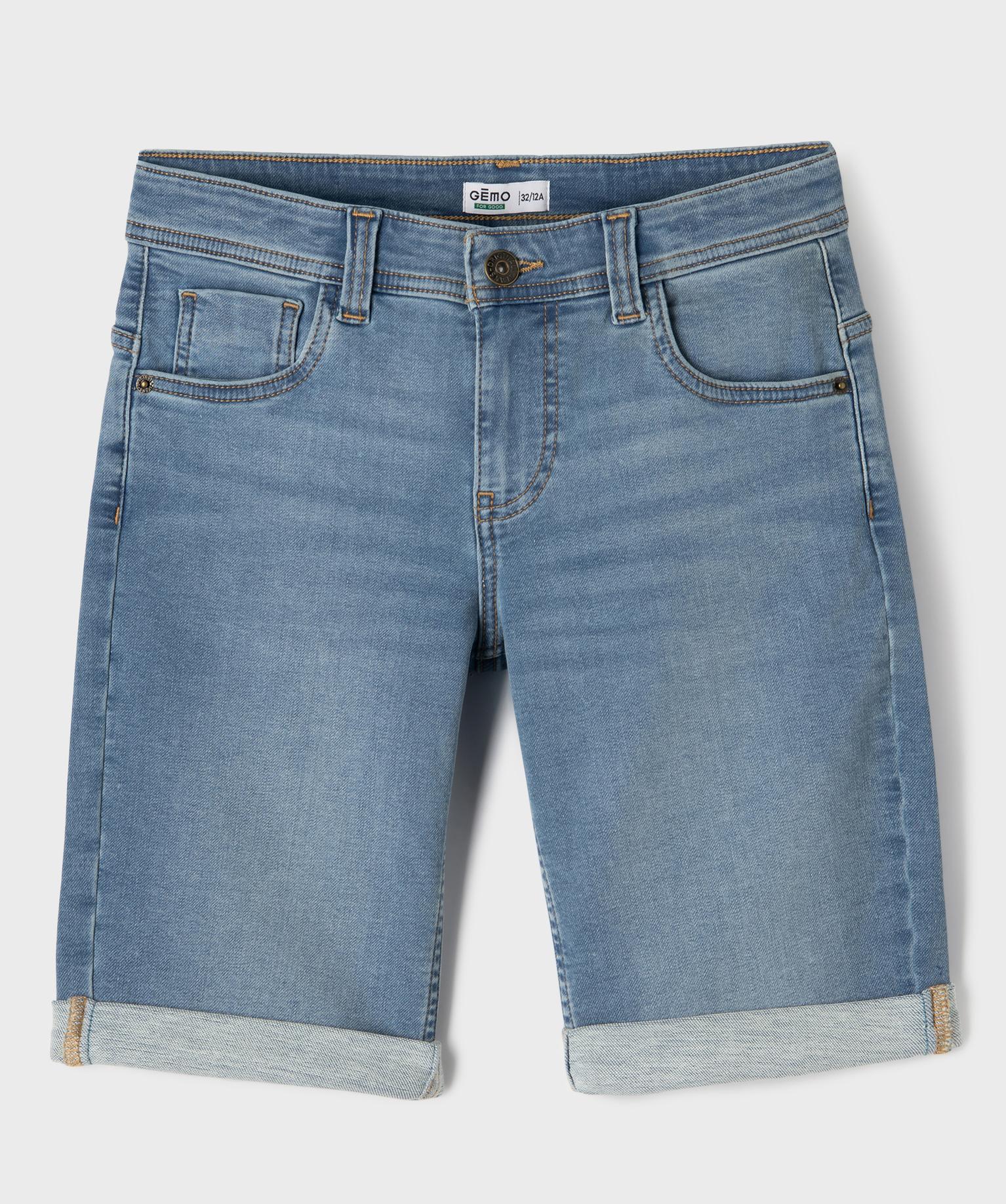 Ce bermuda en jean extensible promet aux ados un confort exceptionnel ! Un bermuda garçon coupe slim, parfaitement ajusté à la silhouette et doté d’un élastique invisible à la taille. Il affiche un coloris délavé et des revers cousus en bas des jambes, qui lui confèrent une allure décontractée. Un modèle idéal pour composer des looks cool tout au long de l’été, qui s’associe avec un tee-shirt, un polo ou un sweat au gré des envies. Fermeture par zip et bouton. Trois poches rivetées sur l’avant, deux poches plaquées au dos.