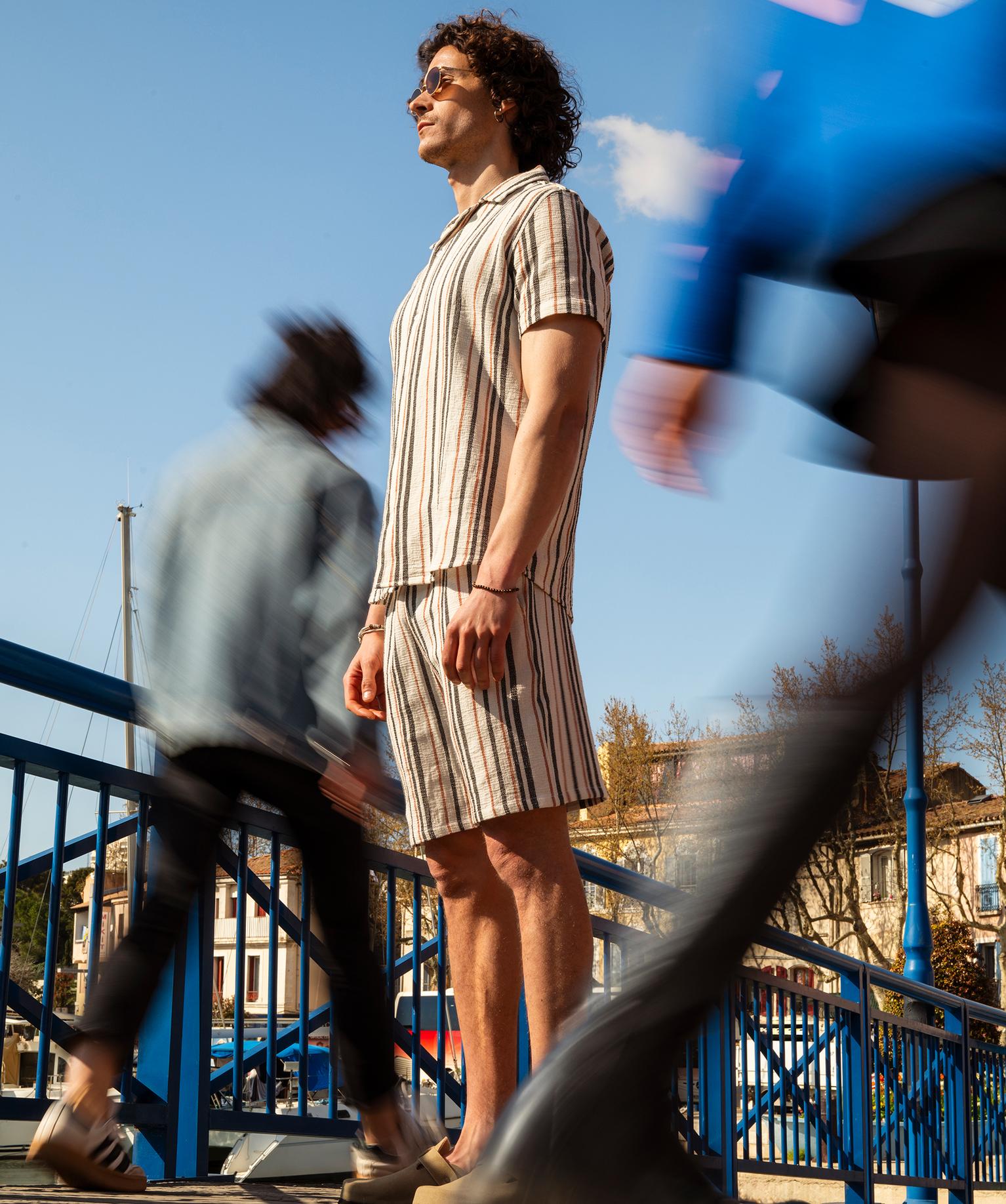 Craquez pour ce bermuda léger, chic et original ! Il se distingue par son tissu dobby : un textile tissé 100% coton qui affiche un relief texturé à la fois respirant et élégant. Les rayures multicolores et d'épaisseurs différentes complètent la sophistication du modèle. Pour le reste, vous êtes sûr d'enfiler un bermuda homme confortable et adapté à l'été : coupe droite assez large, ceinture élastiquée ajustable par cordon coulissant, longueur mi-cuisse, 2 poches italiennes et 1 poche plaquée au dos.