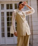 Ce blazer sans manches femme conjugue style et originalité. Avec sa fermeture croisée à boutons-pression argentés, il revisite le tailleur de manière moderne. Son col tailleur classique et ses grandes poches plaquées lui apportent de la structure. Doublé pour plus de tenue et une finition soignée, le blazer possède aussi un bouton-pression intérieur pour un maintien parfait. Légèrement froissée, cette veste s’associe idéalement à la jupe-short coordonnée pour un ensemble chic et contemporain, idéal en cérémonie ou pour un look de bureau raffiné.