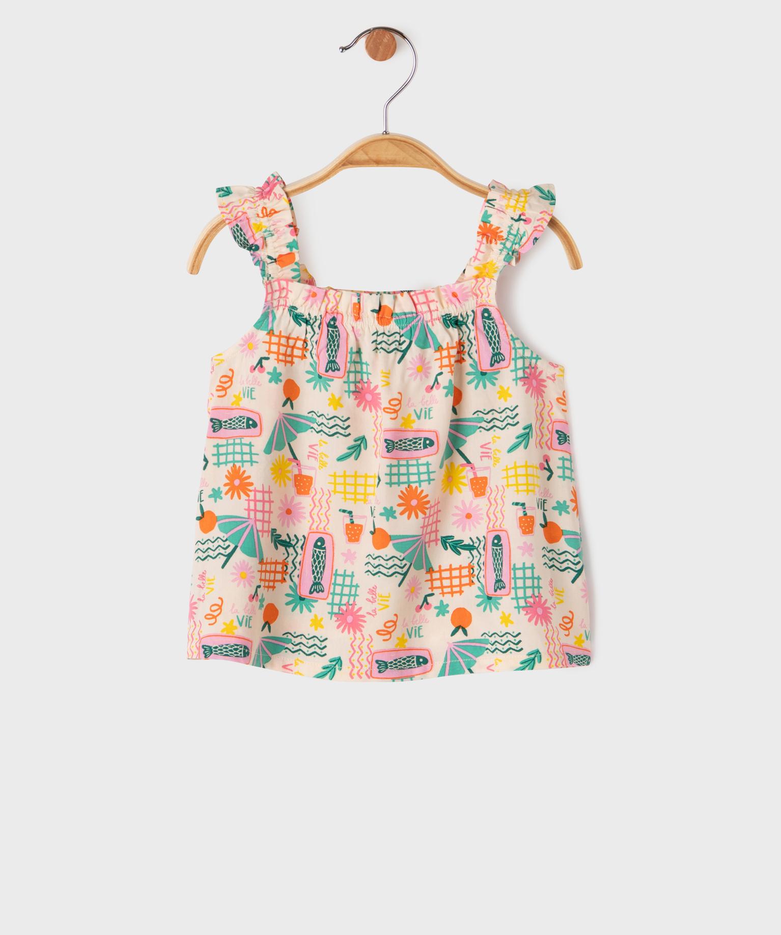 Faites entrer de la couleur et de la légèreté dans la garde-robe de votre fillette avec cette ravissante blouse à bretelles volantées ! Une blouse en viscose légère, imprimée de motifs estivaux joyeux. La blouse bébé fille affiche une encolure carré et volantée devant et dos. Bretelles élastiquées, décolleté élastiqué, coupe ample : tout est pensé pour un rendu plein de charme et un porter ultra confortable. Vous pouvez associer ce petit top à bretelles avec le pantalon assorti pour un ensemble harmonieux, ou avec un short en jean pour un look plus décontracté.