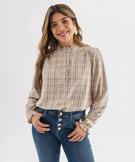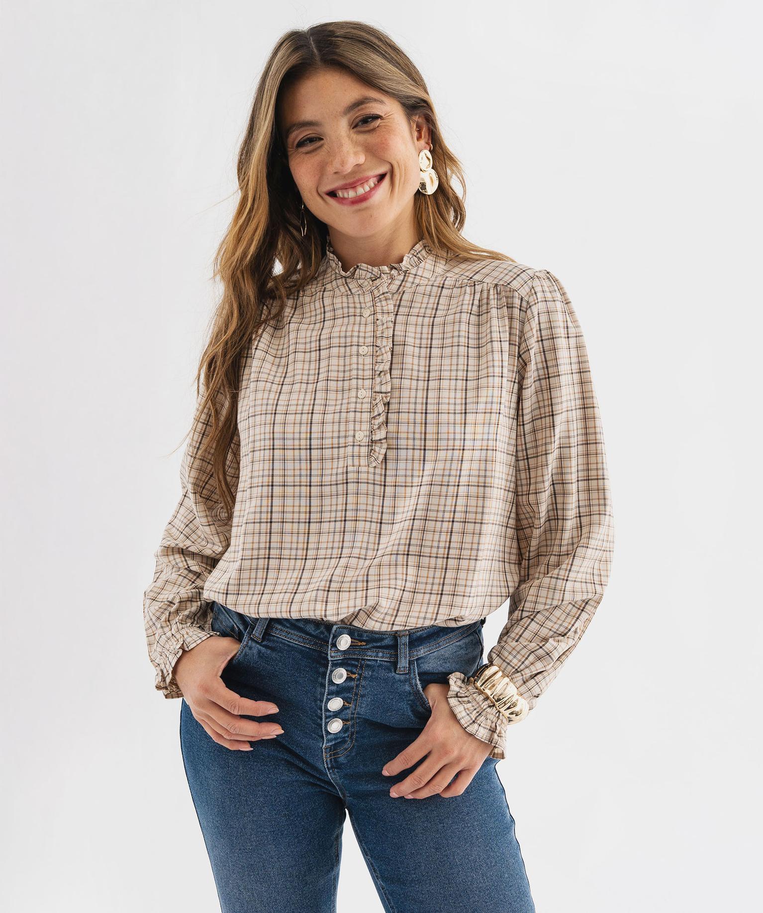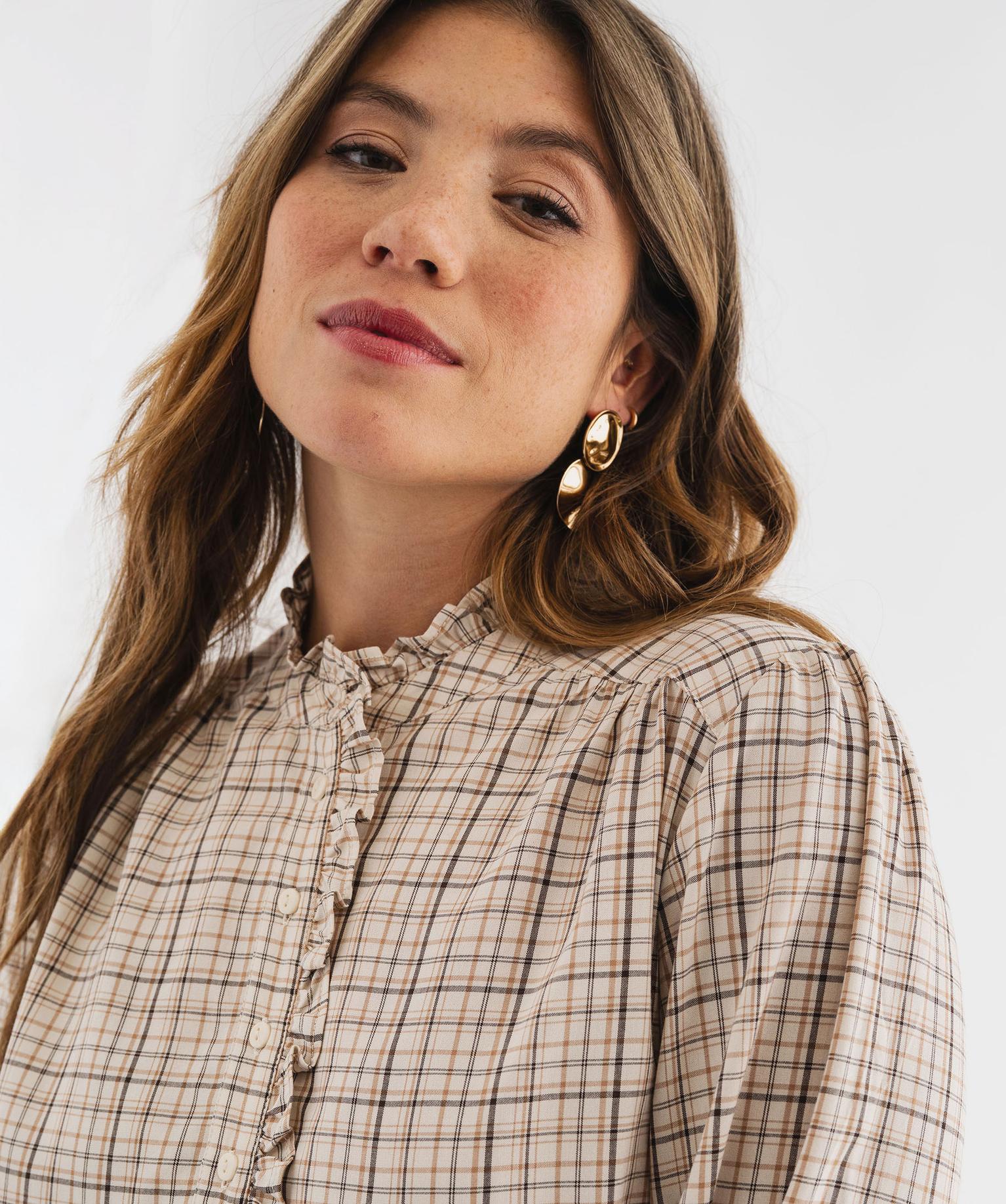 Blouse à carreaux avec finitions froncées femme beige