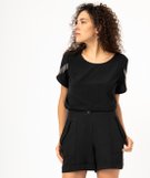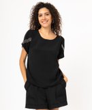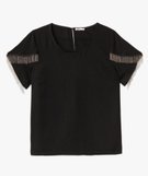 Gémo propose une version rock revisitée du tee-shirt à manches courtes, accentuée par de délicates franges en chaîne métallique le long des manches. Ce tee-shirt pour femme est confectionné dans une matière fluide d'aspect crêpe, lui donnant une allure impeccable. Il présente un large col rond, une coupe ample et des pinces poitrine pour une silhouette flatteuse. L'ouverture goutte à l'arrière du col est fermée par un bouton. Ce haut fluide peut être porté aussi bien en journée qu'en soirée, associé à un jean enduit pour un look encore plus rock !