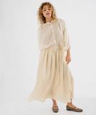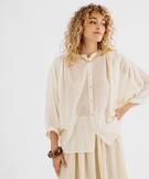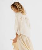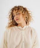 Vous allez adorer le confort et le style unique de cette sublime blouse pour femme. Un modèle orignal qui se distingue par sa coupe oversize accentuée par des fronces, avec manches chauve-souris et bas arrondi. Une blouse fluide aux accents bohème, confectionnée dans une matière légère et vaporeuse légèrement froissée. Elle est dotée d’un col rond et se ferme par une rangée de boutons aux reflets nacrés. Pour mettre en valeur ce chemisier ample n'hésitez pas à jouer les contrastes en le portant avec un pantalon slim. Biais boutonnés en bas des manches.