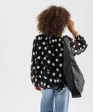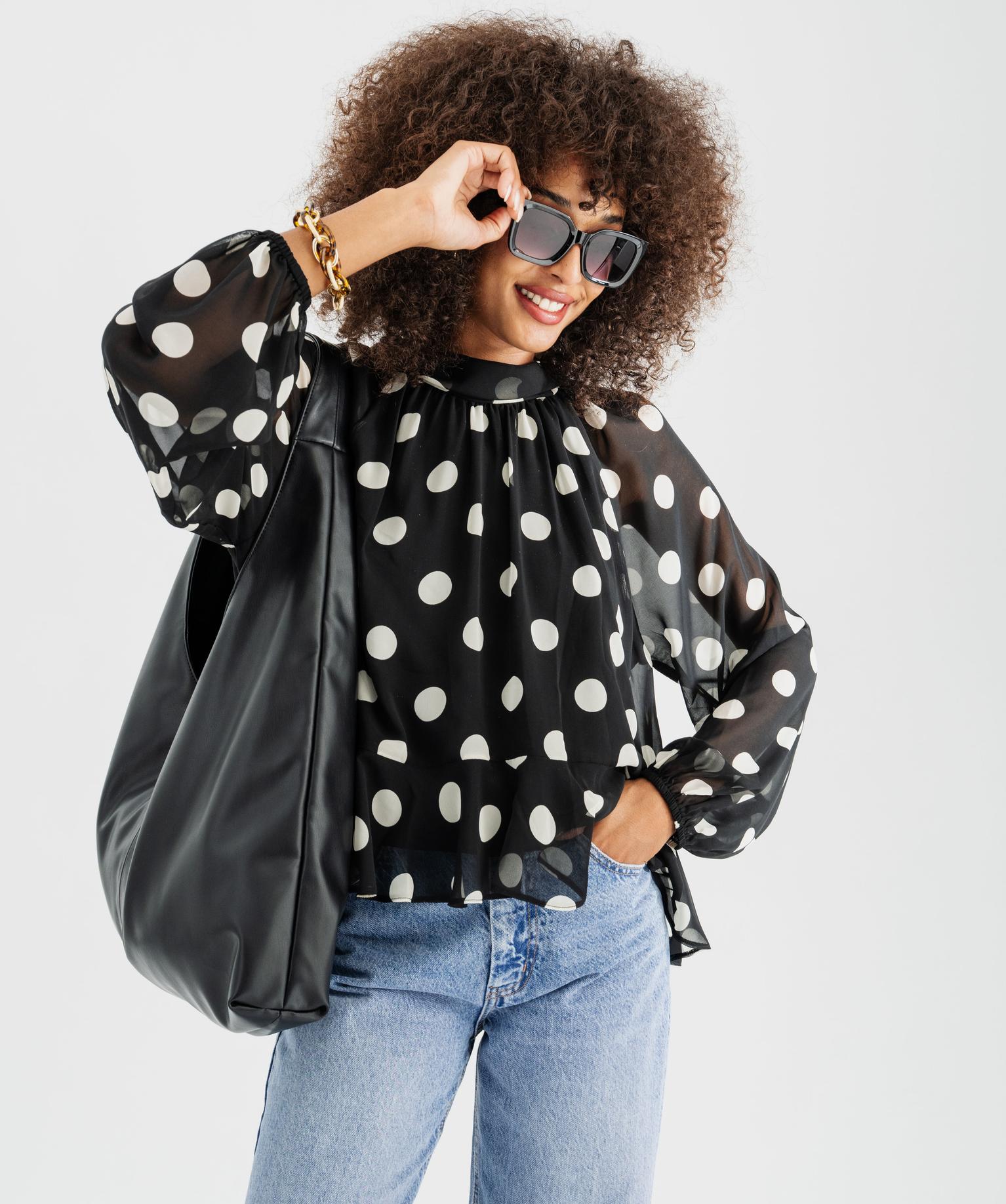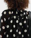 Pièce phare de la saison, la blouse en voile à motif pois tire son inspiration du vestiaire des années 60. Une blouse pour femme au look résolument rétro, qui sublime la silhouette par sa coupe ample avec large volant dans le bas, son joli col rond façon foulard avec liens à nouer dans le dos, et ses fronces sur le décolleté. Ce chemisier à pois est doté de larges manches transparentes, avec emmanchures raglan et poignets resserrés par un élastique. Un haut de soirée fluide à porter avec une jupe crayon ou un pantalon de costume. Bas plus long au dos.