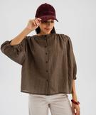 Cette blouse femme joue la carte du volume et de l’élégance avec une touche d’originalité. Confectionnée dans un tissu vichy subtilement satiné, elle capte la lumière avec discrétion. Sous les doigts, le tissu à carreaux présente un petit effet gaufré. La blouse est dotée de manches 3/4 bouffantes et de fronces placées aux épaules et dans le dos qui lui donnent une belle ampleur, pleine de légèreté, inspirée par les blouses d'artiste. La coupe est large, à base droite, rehaussée d’un petit col officier raffiné. Boutons sur le devant et aux poignets.