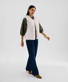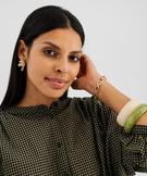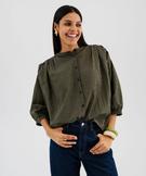 Cette blouse femme joue la carte du volume et de l’élégance avec une touche d’originalité. Confectionnée dans un tissu vichy subtilement satiné, elle capte la lumière avec discrétion. Sous les doigts, le tissu à carreaux présente un petit effet gaufré. La blouse est dotée de manches 3/4 bouffantes et de fronces placées aux épaules et dans le dos qui lui donnent une belle ampleur, pleine de légèreté, inspirée par les blouses d'artiste. La coupe est large, à base droite, rehaussée d’un petit col officier raffiné. Boutons sur le devant et aux poignets.