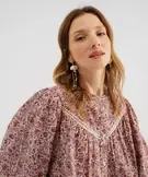 Cette blouse femme se distingue par son voile de coton fin et léger, délicatement imprimé pour un style aérien et féminin. Sa coupe ample offre une grande liberté de mouvement et un style bohème. L'effet blousant est accentué par des manches longues froncées aux épaules et aux poignets. Un galon ajouré et des fronces soulignent élégamment le buste. Le col mao associé à la boutonnière nacrée apporte une touche raffinée. Cette blouse se porte avec un jean flare et des boots une silhouette romantique et actuelle.