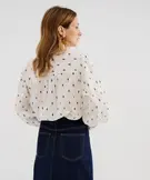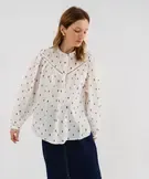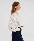 Cette blouse femme se distingue par son voile de coton fin et léger, délicatement imprimé pour un style aérien et féminin. Sa coupe ample offre une grande liberté de mouvement et un style bohème. L'effet blousant est accentué par des manches longues froncées aux épaules et aux poignets. Un galon ajouré et des fronces soulignent élégamment le buste. Le col mao associé à la boutonnière nacrée apporte une touche raffinée. Cette blouse se porte avec un jean flare et des boots une silhouette romantique et actuelle.