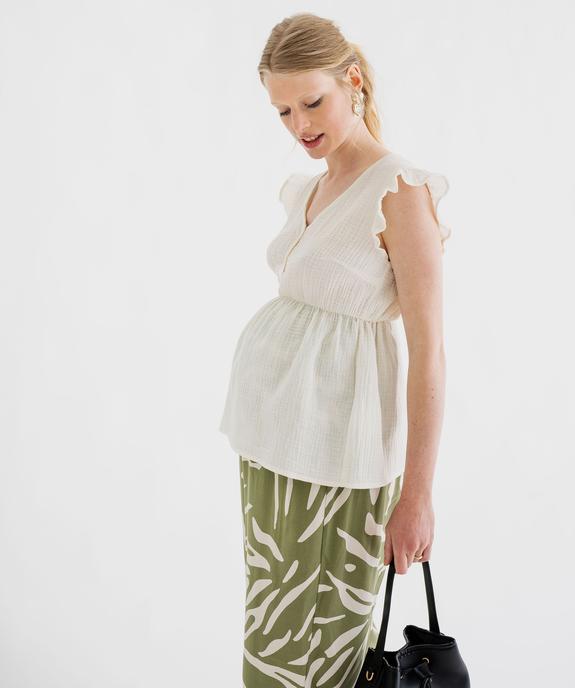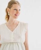 Cette blouse de maternité en gaze de coton sublimera votre silhouette tout en mettant en évidence votre ventre rond. Dotée d’une encolure en V et de volants sur les épaules, elle ajoute une délicate touche romantique à tous les looks du quotidien. Munie d’une ouverture par 3 boutons sur l’avant, cette jolie chemise spéciale grossesse peut également être utilisée lors de l’allaitement. Elle se porte aussi bien avec une jupe qu’avec un pantalon. Pinces poitrine.