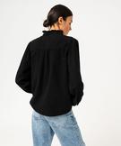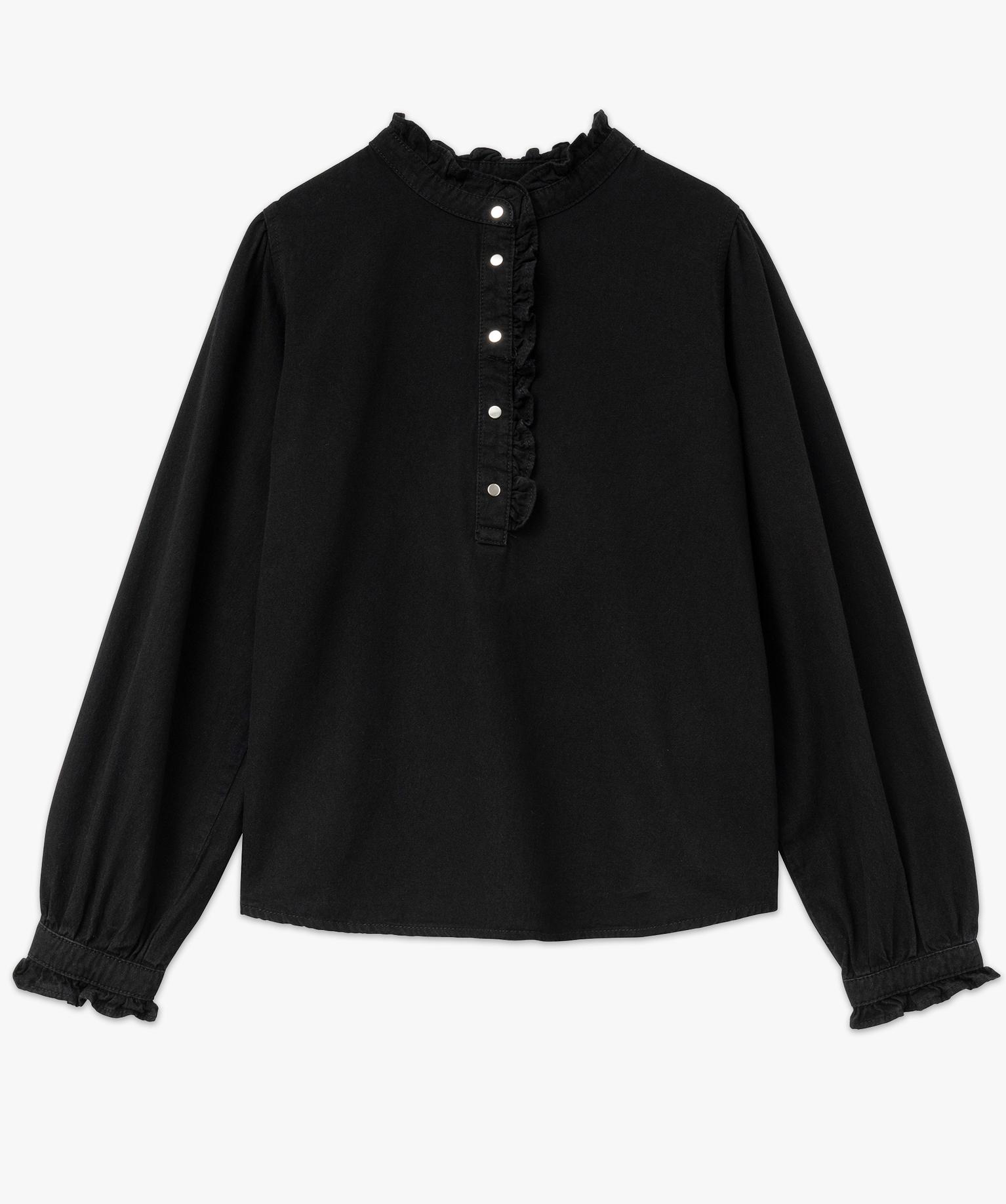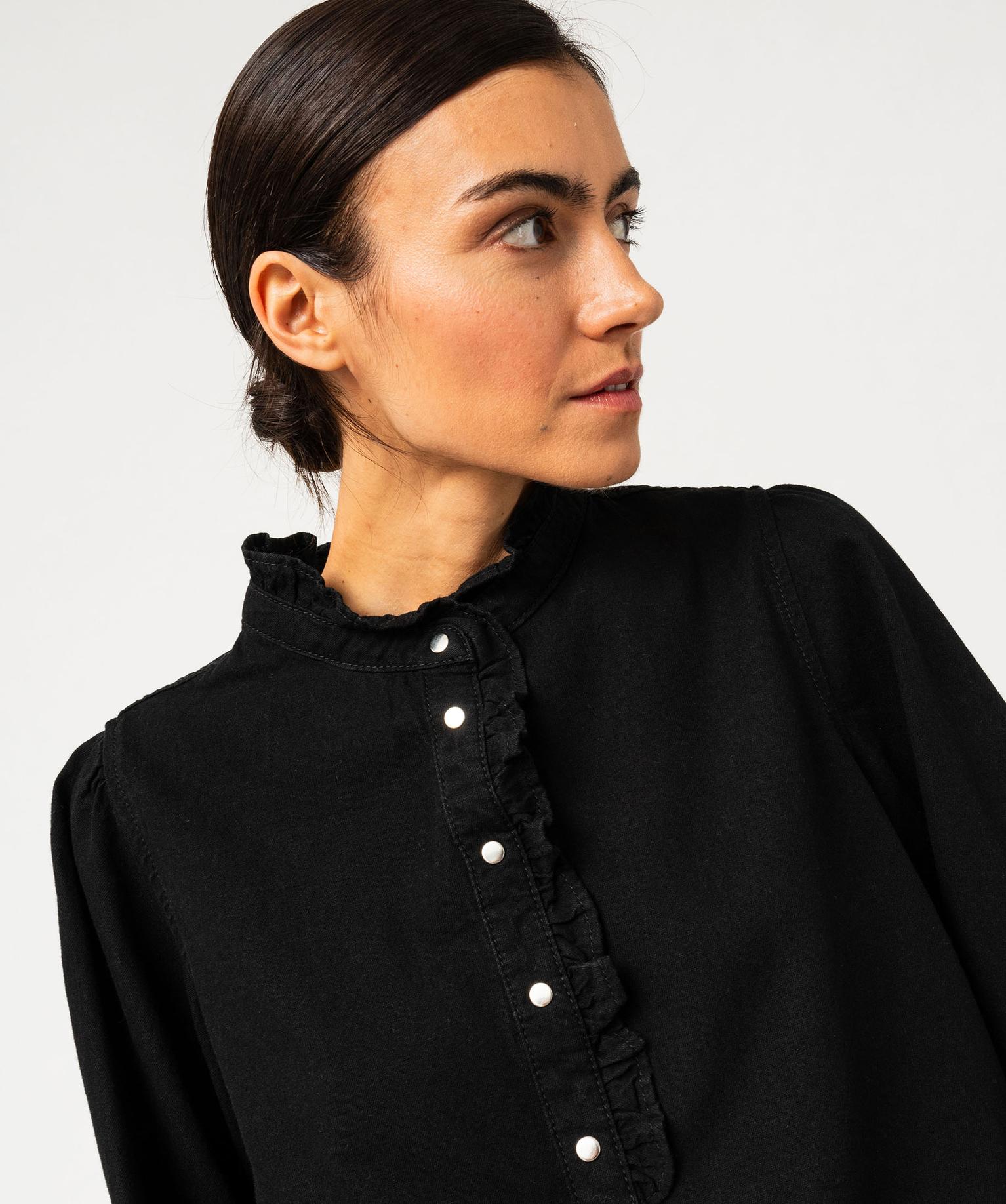 Craquez pour le style boho de cette jolie blouse en toile de coton. Une chemise pour femme agrémentée de fronces au niveau du col et le long de la patte de fermeture. Elle possède de larges manches froncées au niveau des épaules et également dotées de fronces aux poignets. Le col de cette blouse se ferme par boutons pression. Associée à un jean flare et des boots à plateforme, elle compose un look bohème au top de la tendance. Col rond.