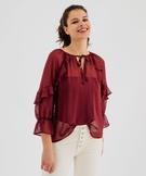 Blouse en voile à manches 3/4 et volants femme bordeaux