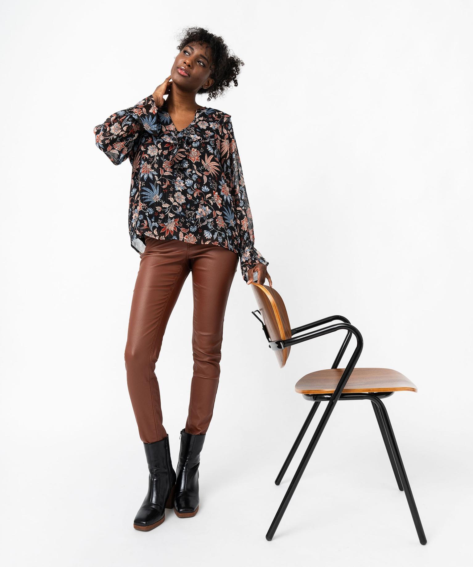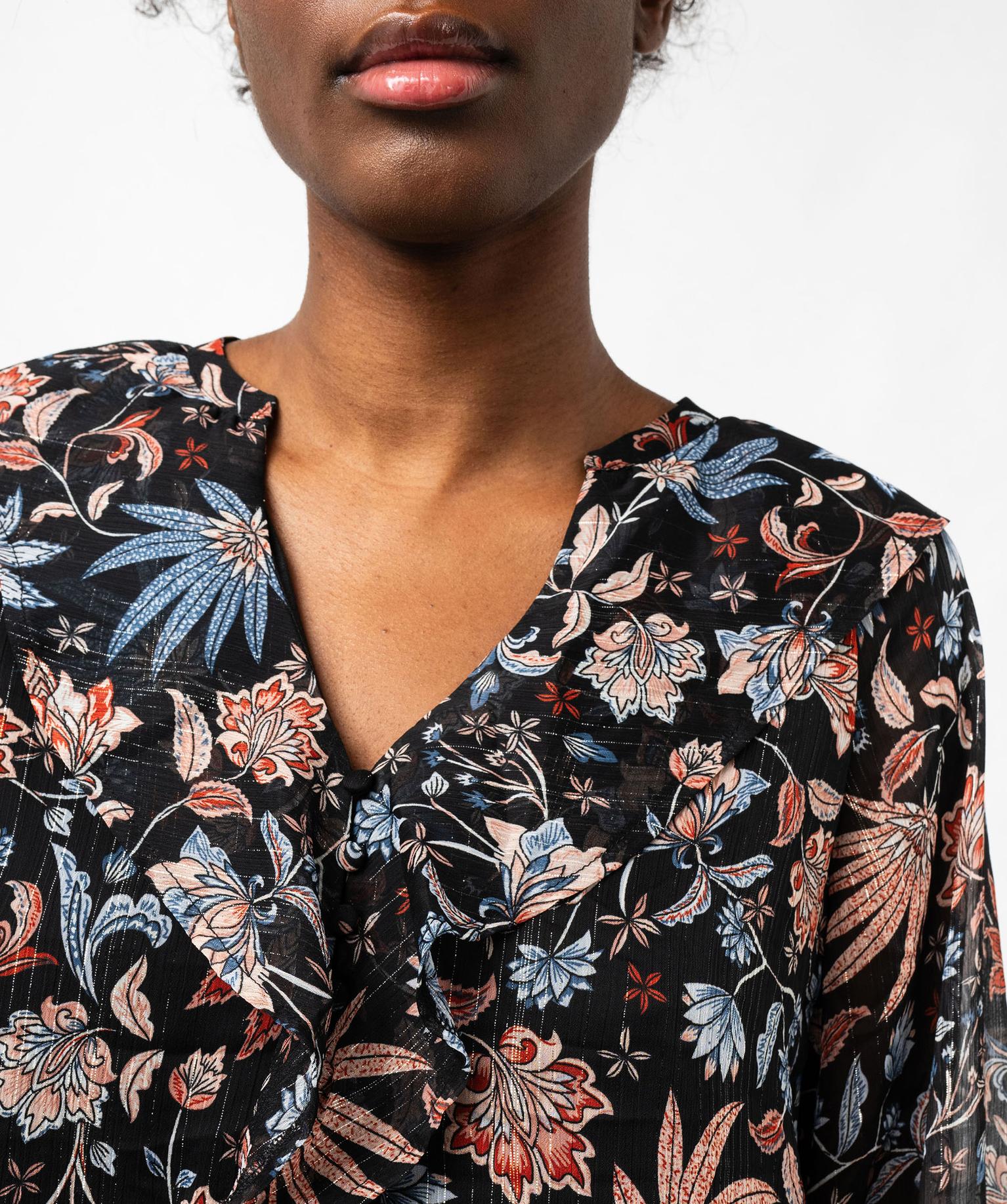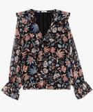 Blouse en voile fleuri à grand col V volanté femme noir
