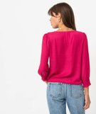 Un décolleté en profond V duquel part un pan croisé pour un effet cache-cœur, des manches 3/4 resserrées par des smocks, des plis et des fronces au niveau des épaules sont autant de détails qui font de cette blouse en satin un haut ultra féminin. La taille resserrée par élastique souligne l'effet vaporeux de la blouse femme. On aime la couleur intense mise en relief par un motif en léger relief ton sur ton. Décolleté fermé par un bouton-pression invisible. Base élastiquée sur l'avant uniquement.