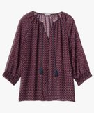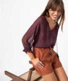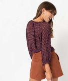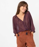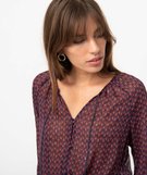 Ajoutez une jolie touche de couleur à vos looks grâce à cette blouse imprimée agrémentée de touches pailletées. Cette blouse pour femme possède un col rond fermé par un cordon à pompons et des manches 3/4 avec emmanchures raglan et poignets élastiqués. Une chemise voile fermée par petits boutons recouverts à porter sur un top à bretelles. Bas fendu sur les côtés.