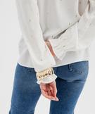 Illuminez vos looks le jour comme le soir avec cette magnifique blouse fluide à motifs pailletés. Une blouse pour femme dotée d’un profond décolleté en V qui sublime le décolleté et de larges manches resserrées par un élastique aux poignets, créant un bel effet froncé. Confectionné en viscose, ce haut de soirée allie à la perfection confort et look raffiné. Il se marie aussi bien avec une jupe droite et des escarpins qu’avec un pantalon large et des derbies.