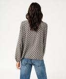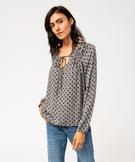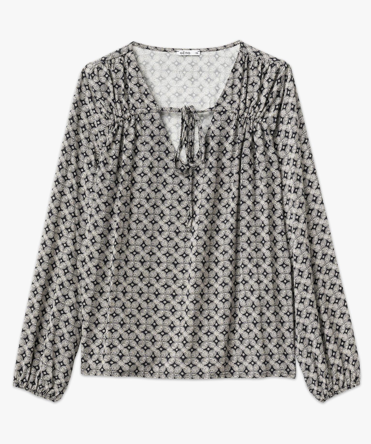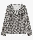 Succombez au charme romantique de cette blouse imprimée. Confectionnée en viscose fluide, cette blouse pour femme offre un toucher doux et confortable. Elle affiche un décolleté original avec fronces sur l’avant des épaules et liens coulissants permettant de moduler le col en V. Ses manches larges sont resserrées par un élastique aux poignets. Une jolie blouse ample à porter avec un pantalon droit et une paire de derbies pour un look élégant en toute simplicité.