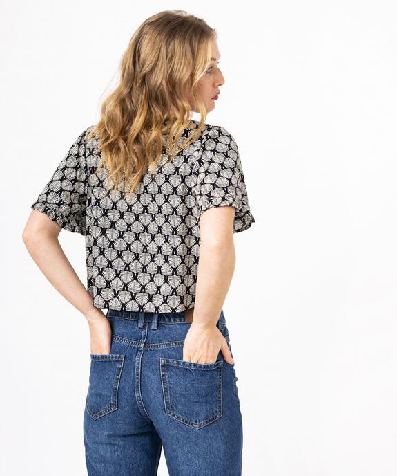 Dynamisez vos tenues grâce à cette jolie blouse pour femme. Une blouse imprimée déclinée dans des coloris pétillants. Elle affiche une coupe courte et ample, des manches courtes évasées avec fronces aux épaules et finitions volants. Cette blouse à col V se ferme par une rangée de boutons recouverts. Confectionnée dans une matière viscose ultra fluide, ce petit top imprimé offre un maximum de style et de confort. Il s’associera parfaitement avec un jean taille haute.