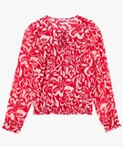 Ravissante blouse femme à l'inspiration hippie chic. La blouse imprimée est entièrement décorée d'un motif aux couleurs contrastées. Elle est confectionnée dans une matière fluide et extensible, avec des manches en voile légèrement transparentes. Elle possède un col rond avec ouverture en V, agrémenté de liens à nouer. Cette blouse ample présente des fronces sur la poitrine, dans le dos et sur les épaules, ainsi que des finitions resserrées par des smocks aux poignets et dans le bas.