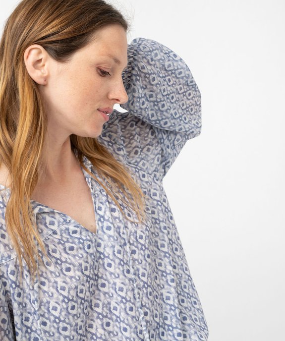 Ravissante blouse femme à l'inspiration hippie chic. La blouse imprimée est entièrement décorée d'un motif aux couleurs contrastées. Elle est confectionnée dans une matière fluide et extensible, avec des manches en voile légèrement transparentes. Elle possède un col rond avec ouverture en V, agrémenté de liens à nouer. Cette blouse ample présente des fronces sur la poitrine, dans le dos et sur les épaules, ainsi que des finitions resserrées par des smocks aux poignets et dans le bas.