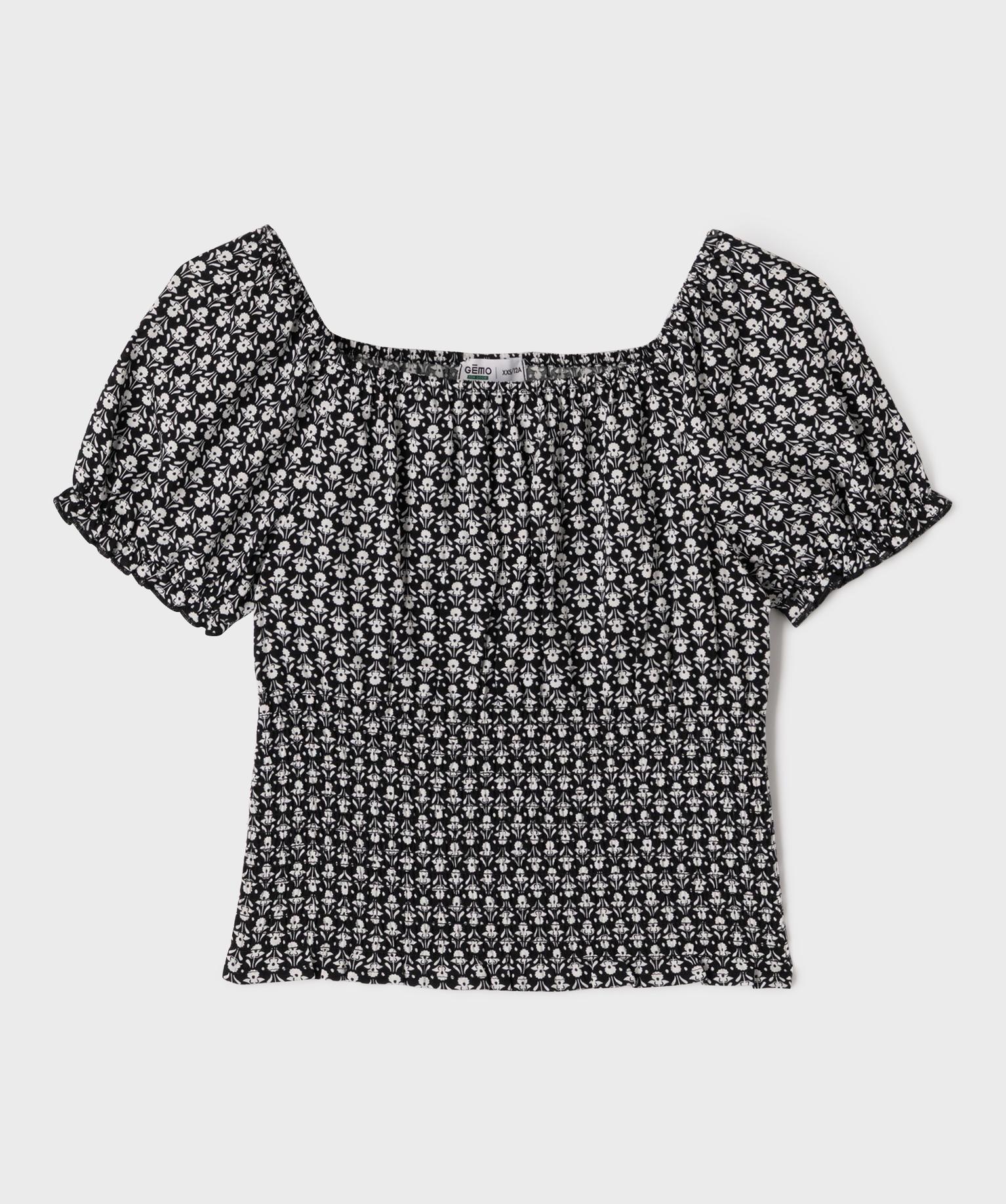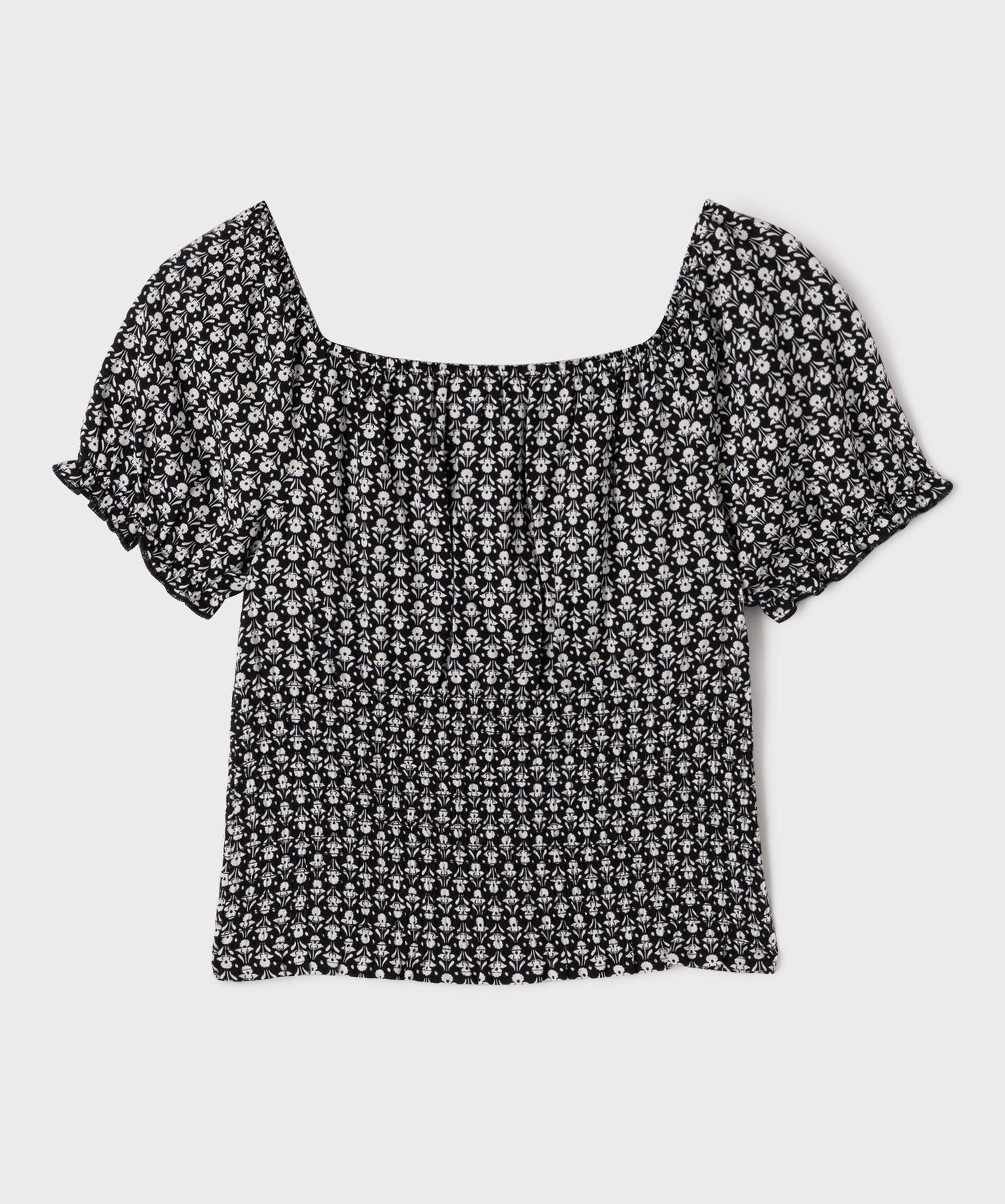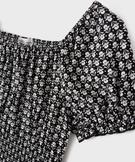 Blouse manche scourtes à taille smockée imprimé fleuri fille noir