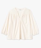Créez-vous des tenues féminines et élégantes sans compromis sur votre confort grâce à ce tee-shirt femme grande taille (du 46/48 au 54/56) aux allures de blouse ! Il est confectionné dans une maille ajourée extensible inspirée de la broderie anglaise, laissant entrevoir la peau. Cette blouse unie possède un décolleté en V et des manches 3/4 blousantes resserrée par un élastique. De petites fronces sur le buste et un pli sous le col donnent de l’ampleur au modèle.