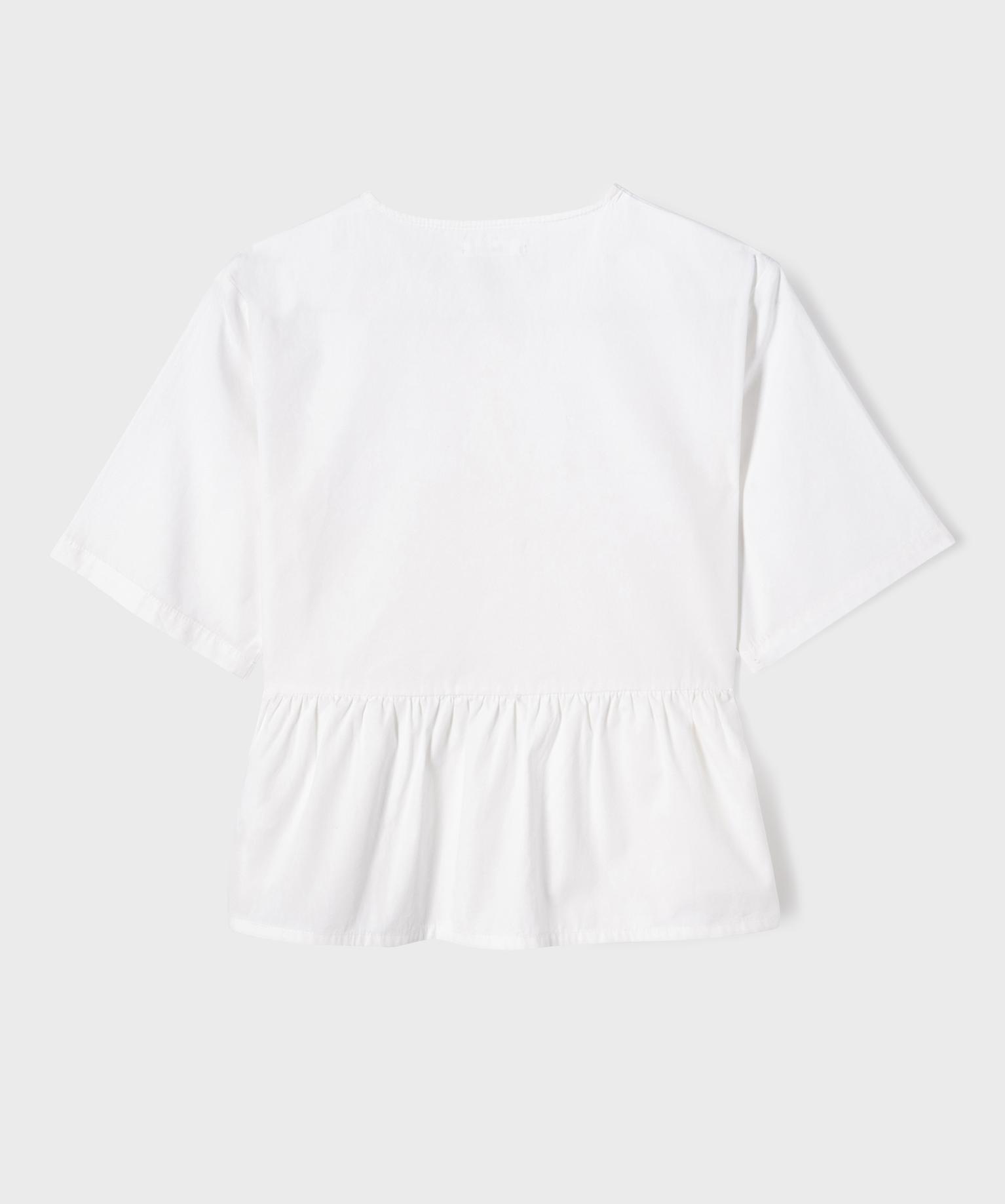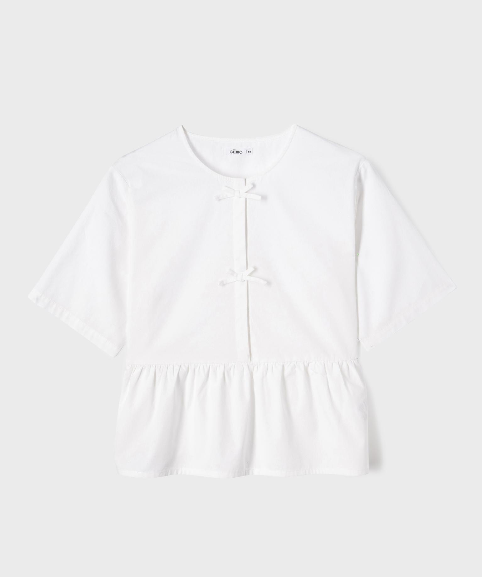 Cette blouse à basque en popeline 100 % coton mise sur le confort et le style. Sa coupe ample offre une grande liberté de mouvement. Le col rond et les manches courtes larges apportent une allure cool et chic. Cette blouse fille s'enfile, mais pour faciliter l'habillage, elle dispose de deux boutons-pression sur l'avant, invisibles pour une finition soignée. De petits nœuds décoratifs ajoutent une touche romantique et délicate sur le devant. La basque donne du volume et du charme à la silhouette. Cette blouse unie s'accommodera aussi bien d'un pantalon rayé pour une touche d'originalité qu'une jupe à fleurs pour un style romantique.