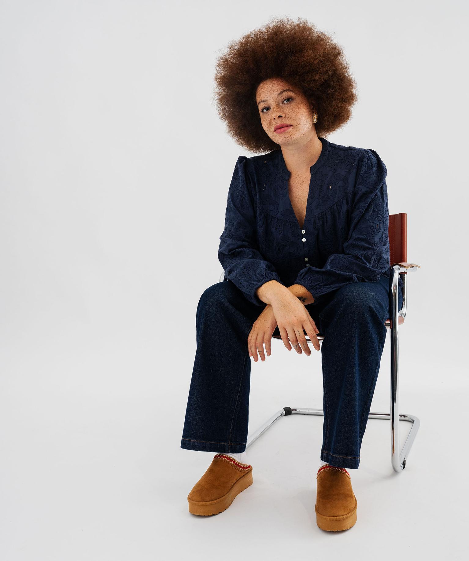Blouse manches longues à broderies fleuries femme grande taille marine