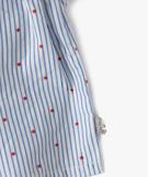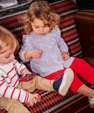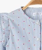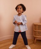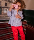 Ajoutez une touche de fantaisie à la garde-robe de votre petite avec cette blouse à manches longues LuluCastagnette, aussi douce que stylée ! Les fines rayures classiques se marient avec de joyeux pois colorés, apportant un contraste ludique et élégant. Les petits volants aux épaules et les finitions froncées aux poignets ajoutent une touche de raffinement. Cette blouse bébé fille se ferme par une rangée de boutons siglés. Evasée sur la partie basse, elle offre beaucoup de confort aux bébés. Cette blouse rayée s’accorde parfaitement avec un jean, mais aussi avec un pantalon en toile pour une allure plus chic. Petit logo Lulu pailleté dans le bas.