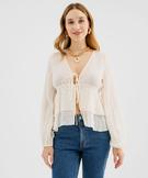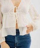 Blouse manches longues à volants et liens à nouer femme blanc