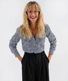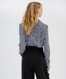 Ravissante blouse pour femme, confectionnée dans une maille gaufrée, fine et extensible, parsemée de délicats motifs fleuris. Cette blouse est dotée de manches longues à poignets boutonnés qui peuvent se porter retroussées grâce à une patte à de boutonnage. Très féminine, cette blouse imprimée possède un col chemise avec décolleté en V et boutons décoratifs. Sa coupe légèrement évasée avec plis creux sous le col offre une grande aisance. Un chemisier à porter avec un pantalon de tailleur pour une allure élégante ou un jean pour un look plus cool. Bas arrondi dans le dos.