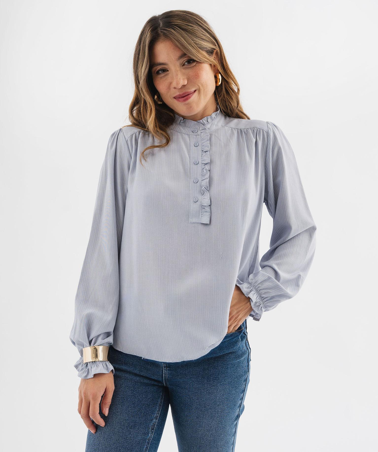 Adoptez un look classique aux accents romantiques grâce à cette jolie blouse rayée pour femme dotée d'un joli col victorien. Confectionnée en viscose, elle offre un toucher souple et fluide et une coupe ample très confortable. Elle est agrémentée de fronces sur le col, la patte boutonnée, les épaules et dans le dos. Les manches larges sont resserrées aux poignets par un élastique, offrant également d’élégantes fronces. Un chemisier au bas arrondi qui peut se porter rentré dans un pantalon ou ceinturé sur une jupe droite.