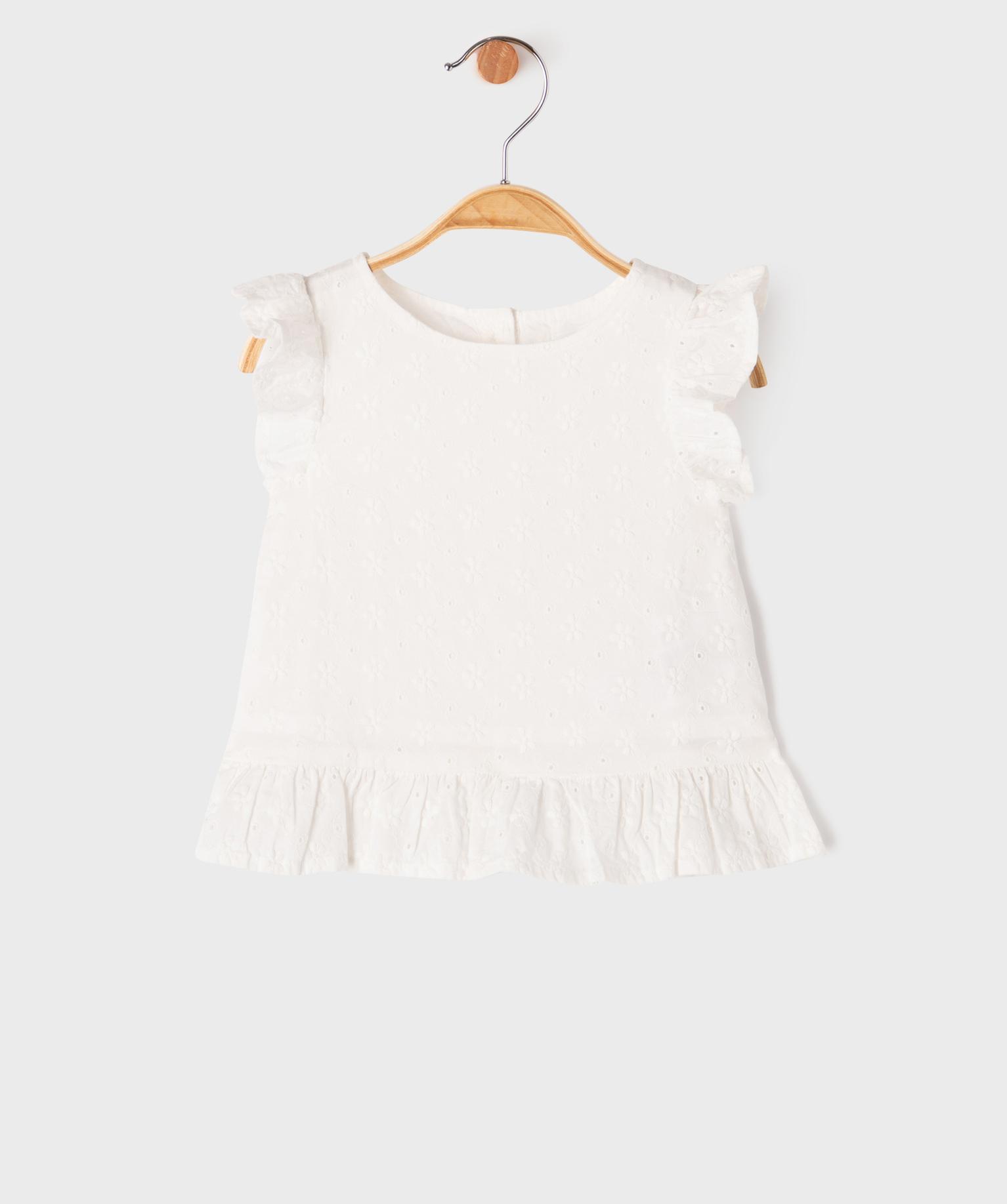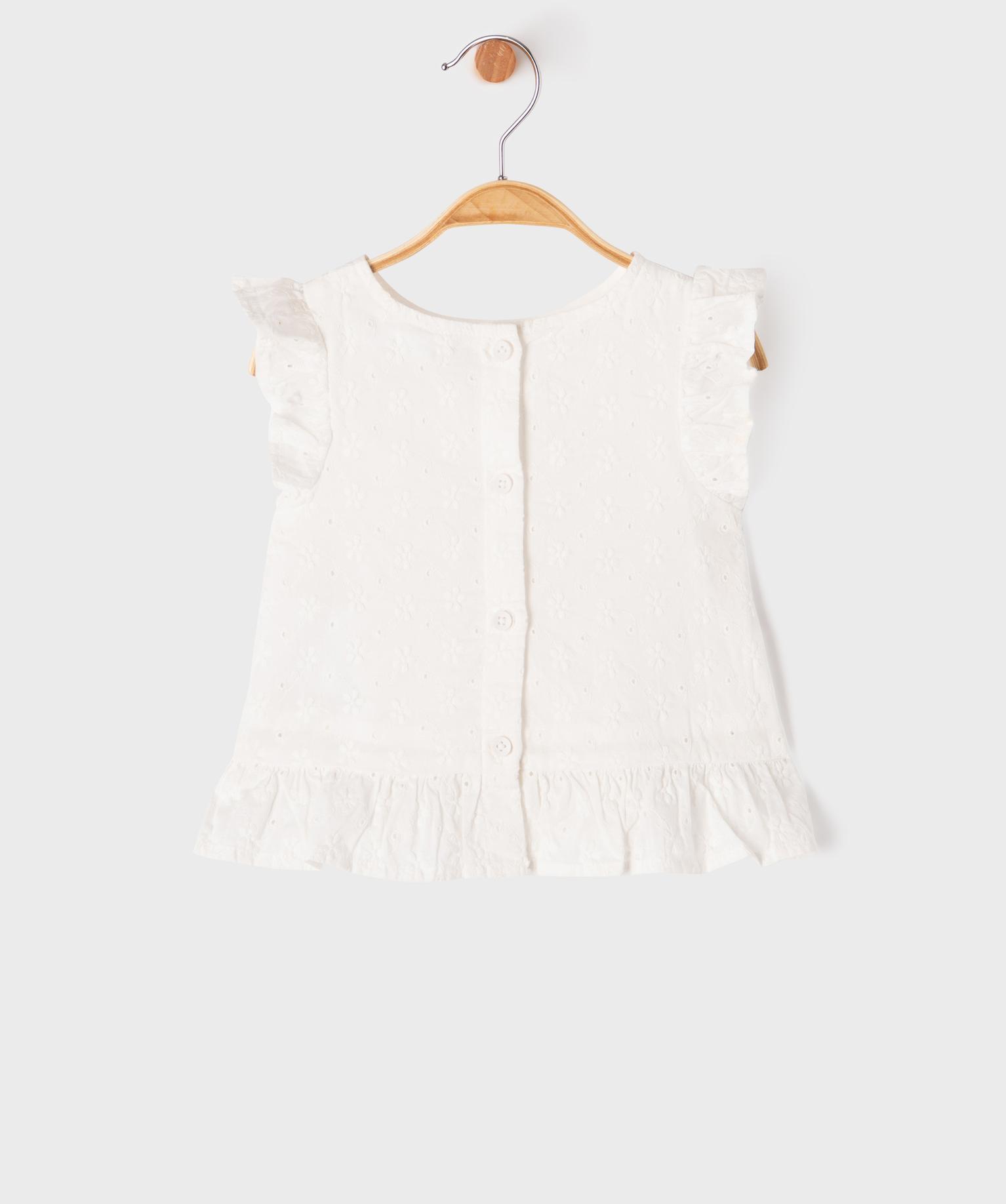 Confectionnée en coton et sublimée par une jolie broderie anglaise, cette blouse bébé fille se pare de délicats volants sur les épaules et à la base, pour une allure pleine de légèreté. Un modèle à la fois pratique et raffiné, fermé par de petits boutons dans le dos. Une blouse brodée, entièrement doublée, à la fois fraîche et élégante, idéale pour les beaux jours. Elle se porte au quotidien avec un jean ou avec un pantalon en lin lors des cérémonies estivales.