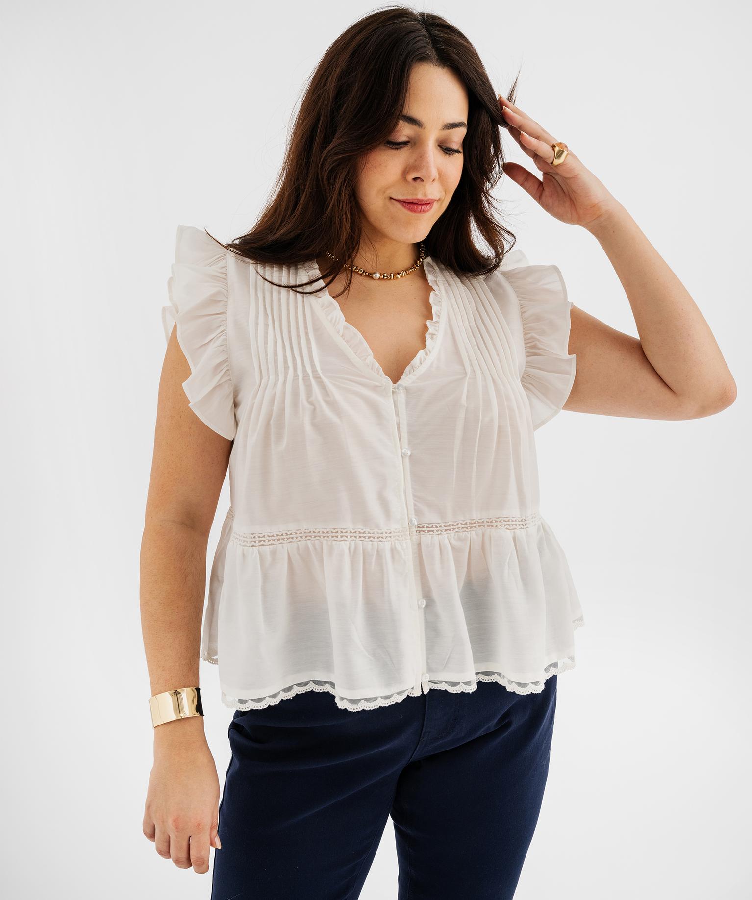 Cette superbe blouse sans manches vous assurera une allure élégante pleine de romantisme. Conçue dans une matière fluide et légère, elle est agrémentée de petits plis sur le haut du buste, de petites fronces sur le décolleté et de bandes de dentelle dans le bas. Sur cette blouse femme grande taille (du 46 au 54), de jolis volants flottent sur les épaules, créant un effet aérien très chic. Ce modèle au profond décolleté en V se ferme par une rangée de boutons aux reflets nacrés. Une blouse à volants à porter avec un jean slim au quotidien et un pantalon fluide pour les occasions festives.